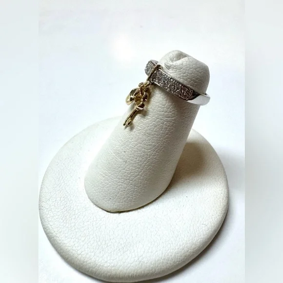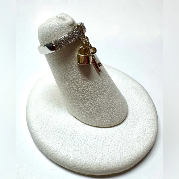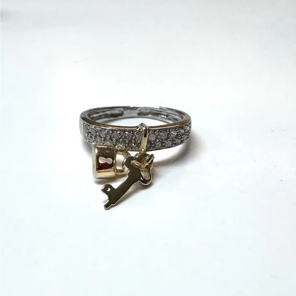 14K Yellow And White Gold .17ctw Natural Diamond Lock & Key Band Ring. It is a size 2.75. The ring features Natural Round cut Diamonds with an estimated Color and Clarity grade of G-H/I1-I2. The Diamonds are estimated to weigh a total of .17ctw. The ring weighs 1.1 DWT. This retails for $1000. The charm bar does not slide on the ring, the key and lock move but it will not slide on the band.