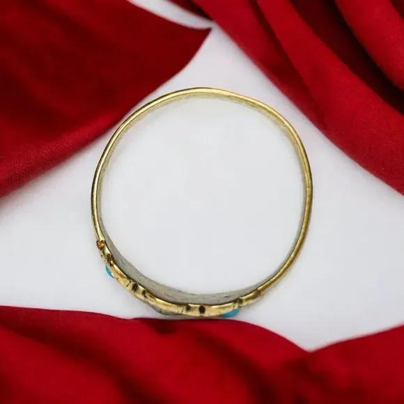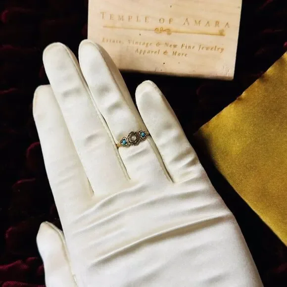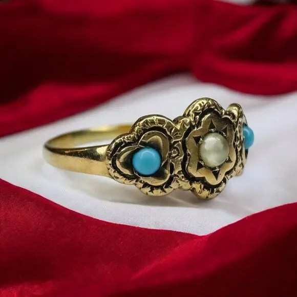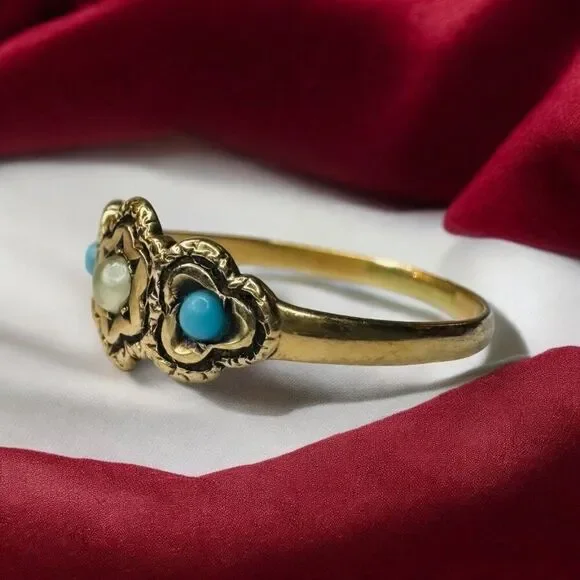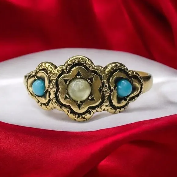 Antique 10k Gold Turquoise Seed Pearl Ring Sz 5.25 Three Stone Flower Ring 1.1g