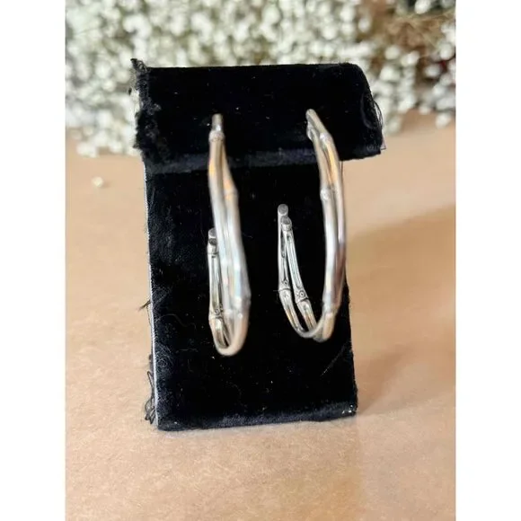 John Hardy Silver Bamboo Twist Hoop Earrings Womens Large Type Size 2 Inch DiameterThese striking John Hardy earrings feature a unique double bamboo twist design in sterling silver. The 2 inch diameter provides a bold look while still maintaining comfortable wear. Perfect for adding a touch of elegance to any outfit.Condition: Like new condition.Features: Silver-Tone, Clasp Fastening, Bamboo Twist, 2 Inch Diameter, Sterling SilverBrand: John HardyType: HoopStyle: Bamboo TwistColor: SilverMaterial: Sterling SilverMeasurements:See pictures.Tags: John Hardy, Earrings, Silver, Bamboo, Hoop, Twist, Sterling, Womens, Large
