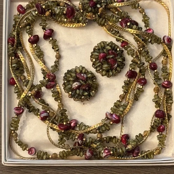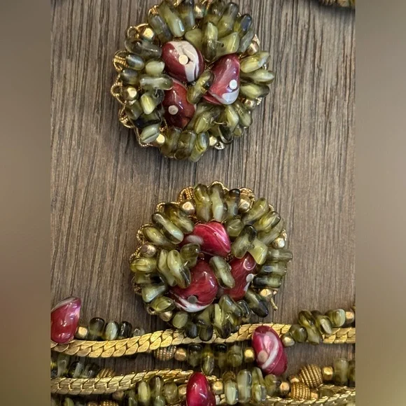 Hattie Carnegie VTG Green & Fushsia Glass Bead Multi Strand Necklace Earring Set