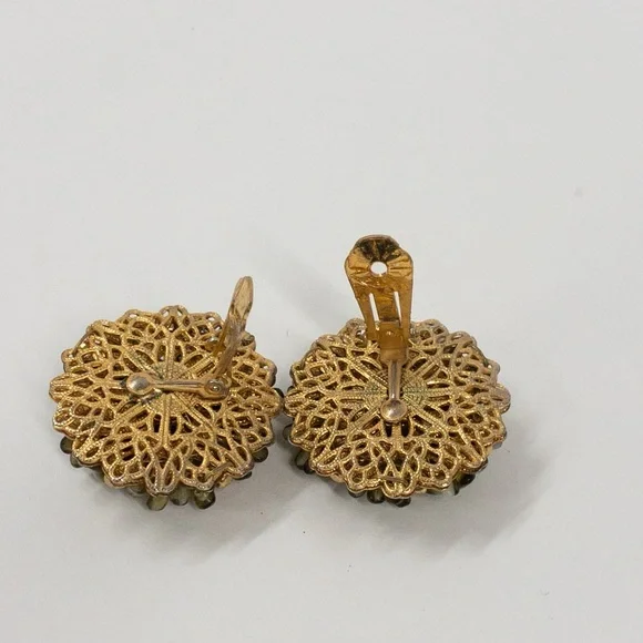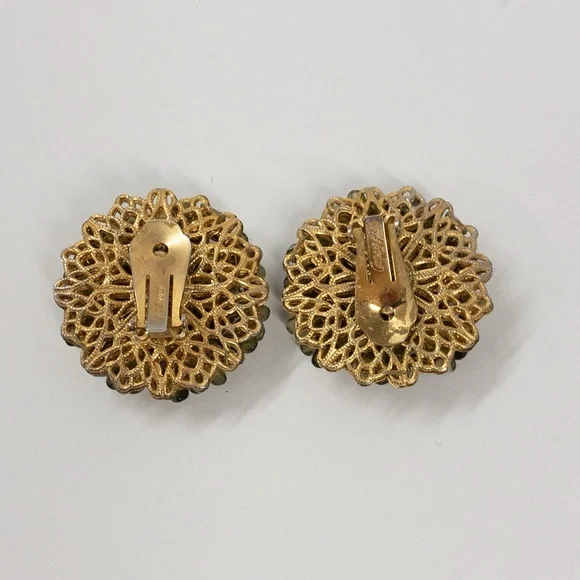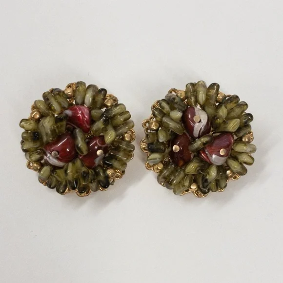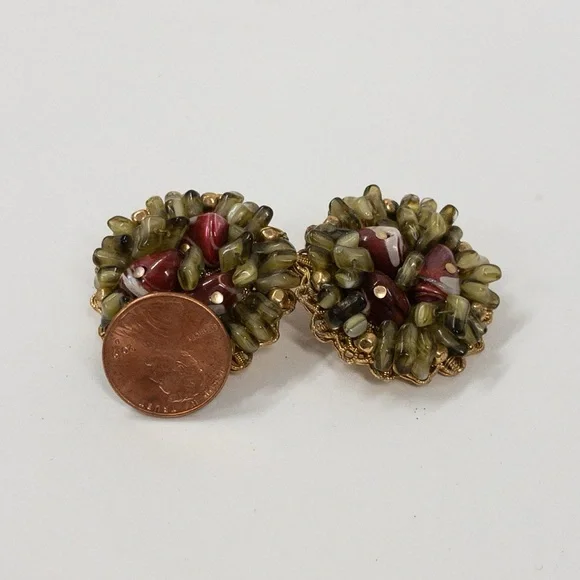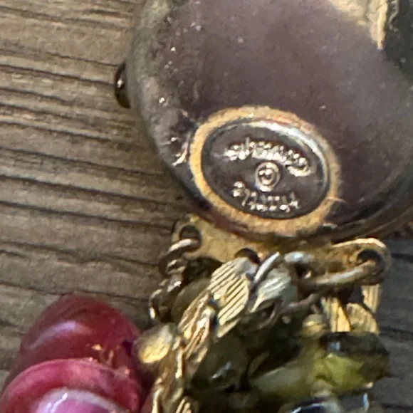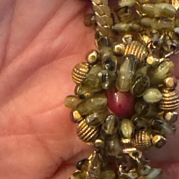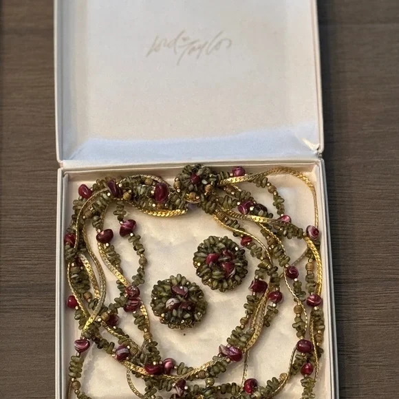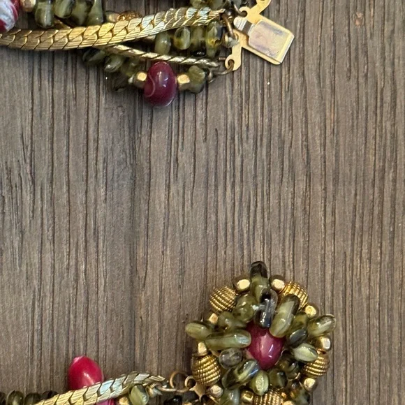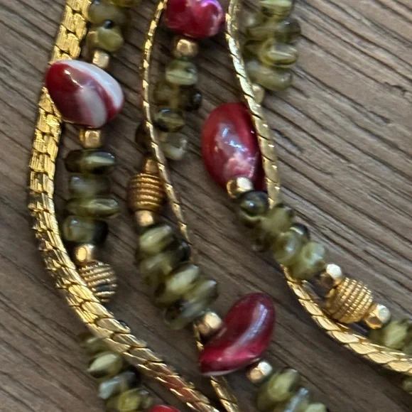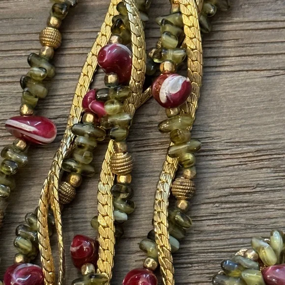 This vintage jewelry set by Hattie Carnegie features a multi-strand necklace and matching earrings. The beads are made of high-quality glass and come in a beautiful combination of green, fuchsia, and gold. The set is perfect for those who love vintage and antique jewelry and want a unique piece to add to their collection. The brand name adds to the value of this set, making it a great investment for those who appreciate quality craftsmanship and timeless style.Hattie Carnegie VTG Green & Fushsia Glass Bead intertwined gold tone herringbone chain Multi Strand Necklace Earring SetSigned on backMeasures approximately- Necklace 32” long Earrings - clip on - 1.5”Clips function properly Minor wearStunning - please see photos for more details