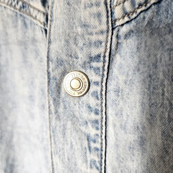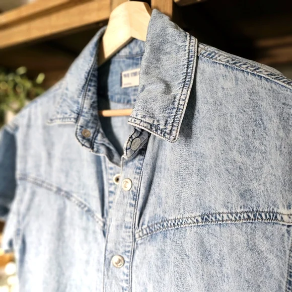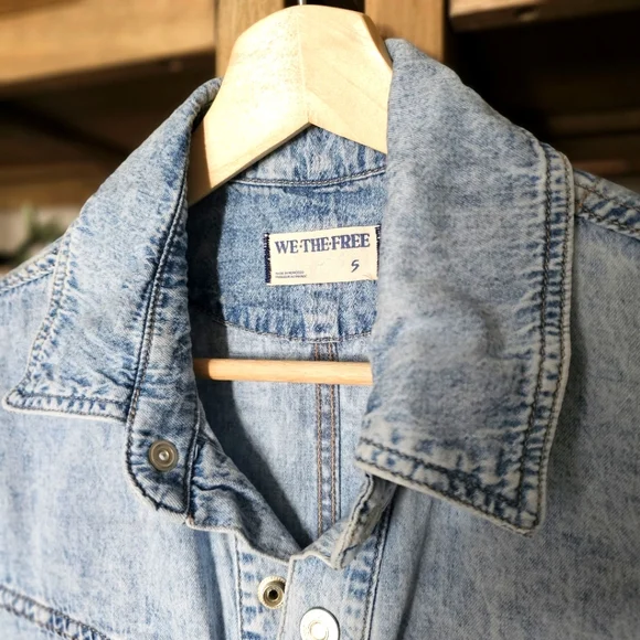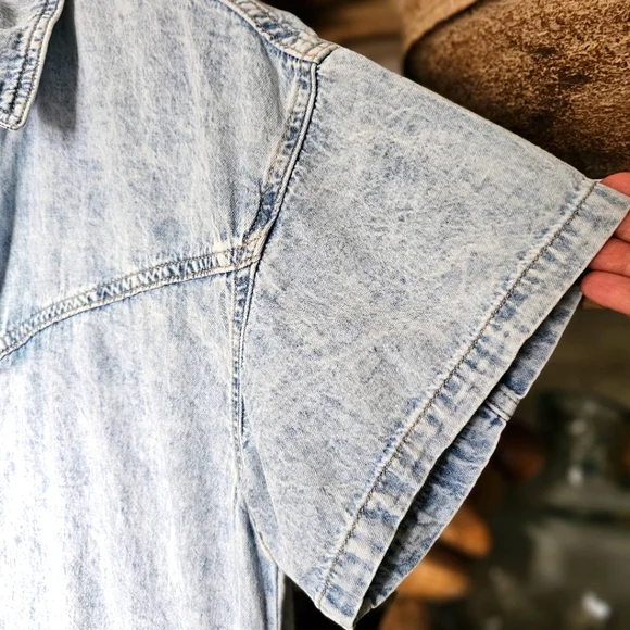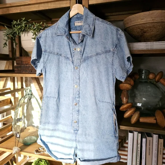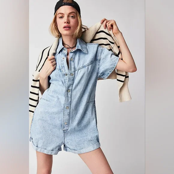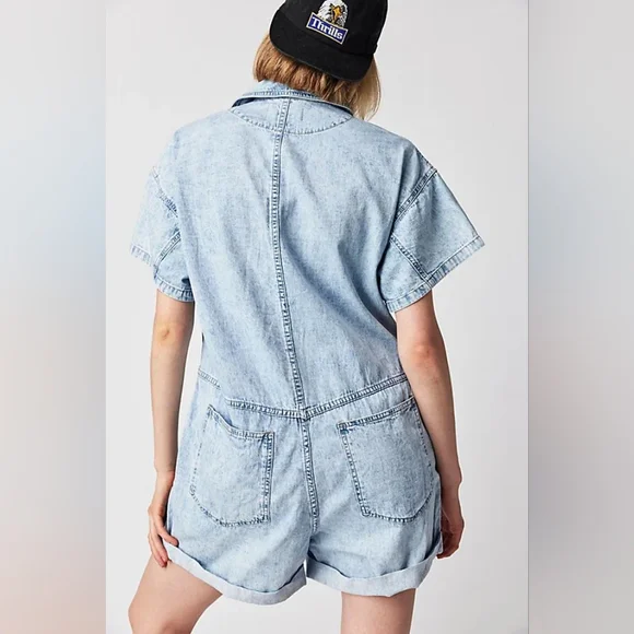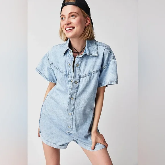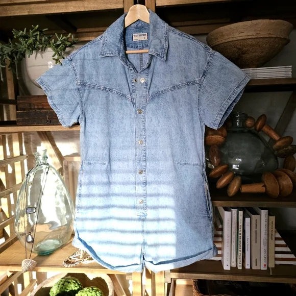 Free People Renegade Denim Coverall RomperSize Small | Light Wash | Effortlessly Cool One-PieceYour go-to summer uniform with a hint of rebel soul. From Free People´s coveted We The Free collection, this Renegade Coverall blends vintage Americana with laid-back California cool. The lightly faded denim gives it that worn-in softness and lived-in look we all crave — like your favorite thrift store find, but better.Designed in a shapeless, relaxed silhouette, it features:Soft light wash denim with a broken-in feelWestern yoke seam details for subtle structureRolled cuffed hems and short sleeves for easy movementFull front button closure for styling flexibilitySide pockets and breezy fit for effortless comfortCollared neckline for a touch of tomboy charmPairs effortlessly with:White sneakers or suede mules for an off-duty lookMoto boots or a chunky cardigan for cooler eveningsA vintage baseball cap and canvas tote for Saturday farmers market runsThis is a no-fuss, all-attitude piece that wears you in, not out. Think: desert drives, denim-on-denim moments, weekend brunch with bedhead.Excellent pre-owned condition — no flaws.