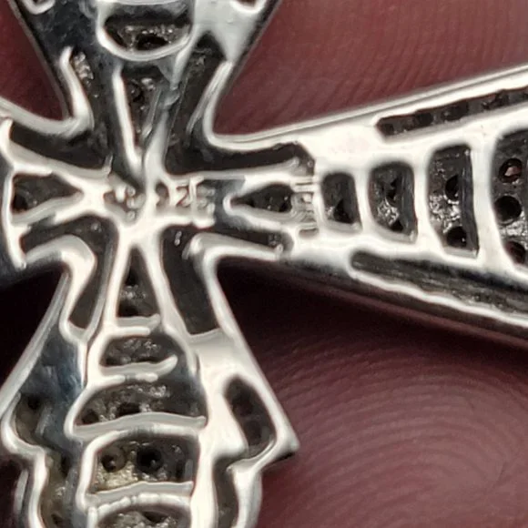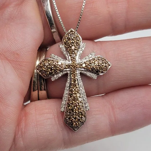 Gorgeous Brown and White diamond cross set in Sterling silver!!This lovely cross is 1.5" tall and almost 1" wide.It is made of sterling silver and set with 34 white and 87 brown...