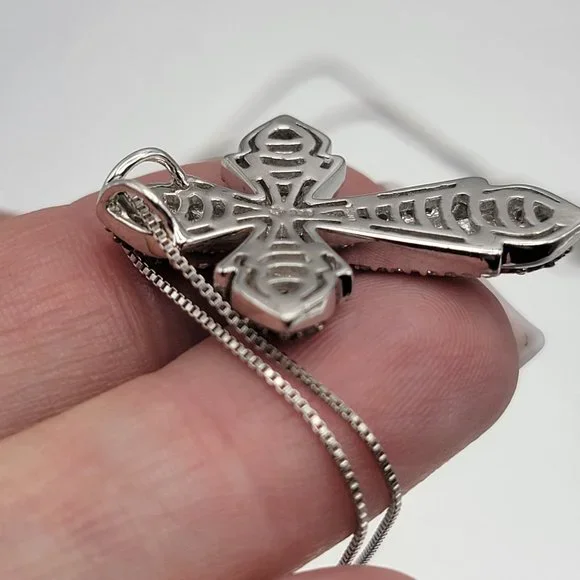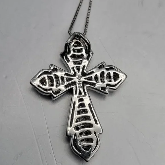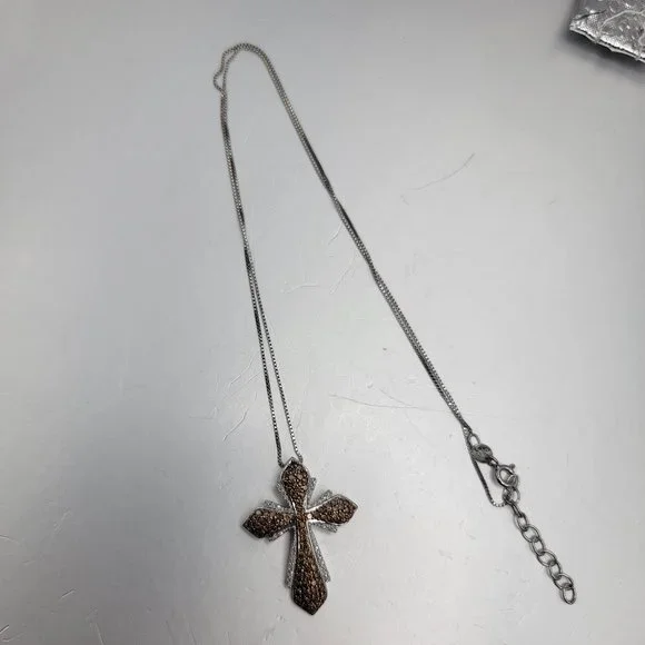 Gorgeous Brown and White diamond cross set in Sterling silver!!This lovely cross is 1.5" tall and almost 1" wide.It is made of sterling silver and set with 34 white and 87 brown diamonds for approx 1.2 ctw.The back is marked 925 India.The cross hangs on a sterling silver box chain that is 18" with 1" of extension links and a spring clasp.Excellent condition!!