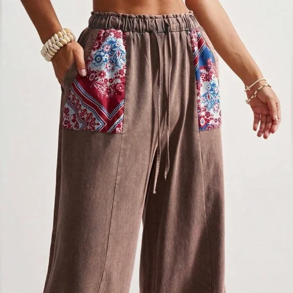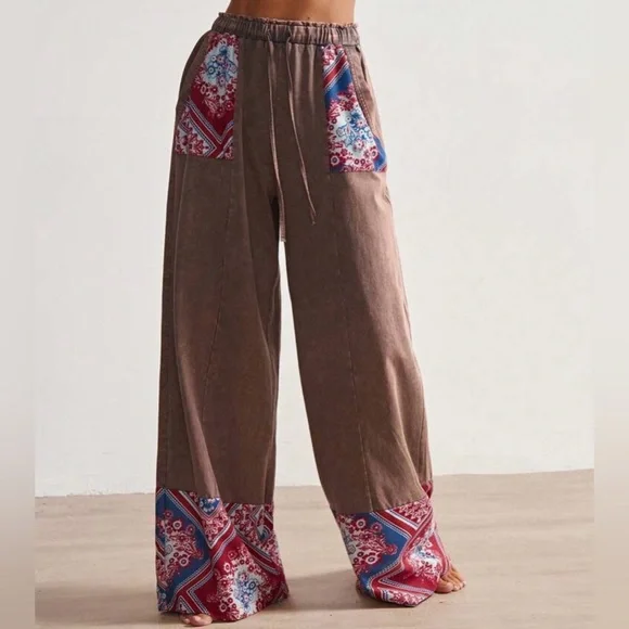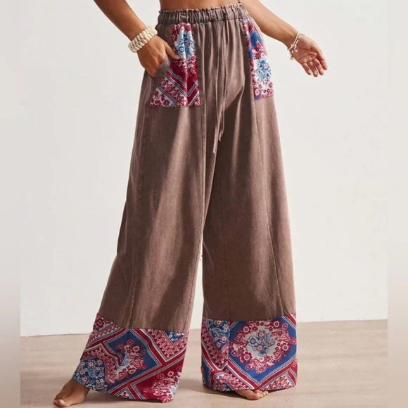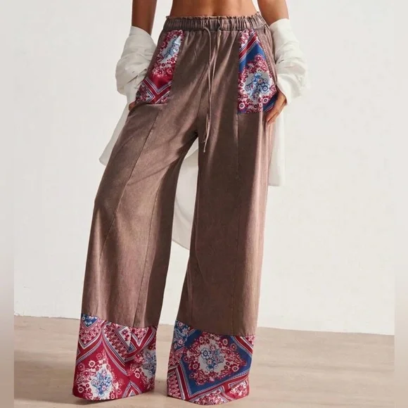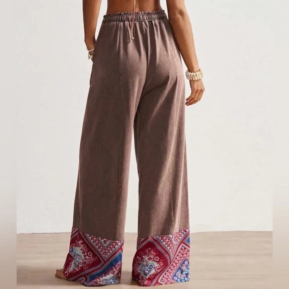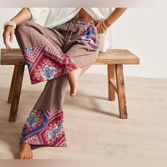 Embrace a bohemian vibe with these stylish brown pants featuring vibrant red patterns. Perfect for a casual day out or a relaxed evening.