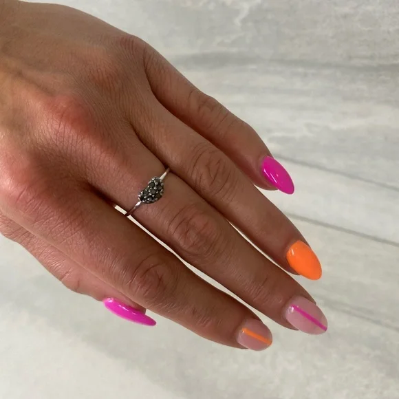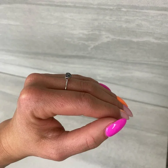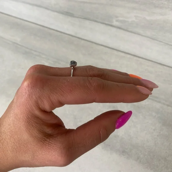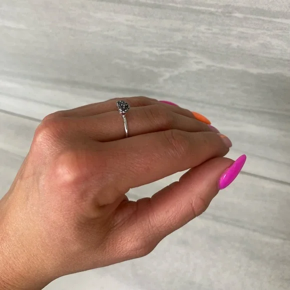 Such a fun ring on its own or a great stackable piece! Never Worn!Size: 6.5Metal: 18kt white gold (stamped inside ring)Designer: Barry Kronen (stamped inside ring)Diamonds: 8 x 1.00mm black diamonds Total carat weight: approximately 0.04 carats