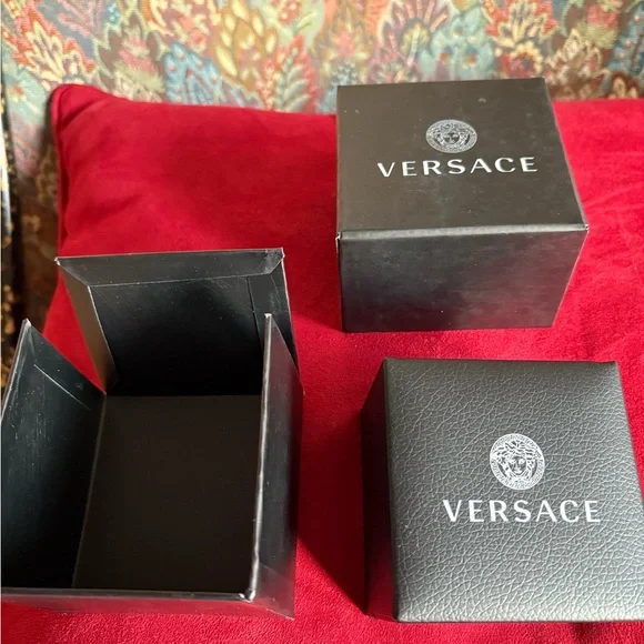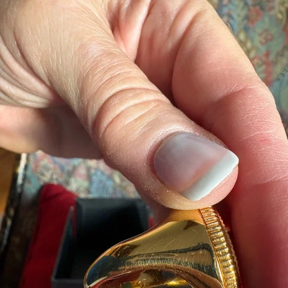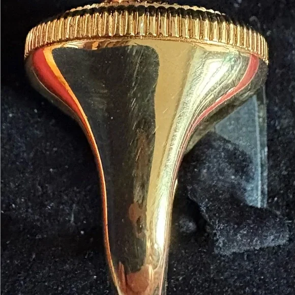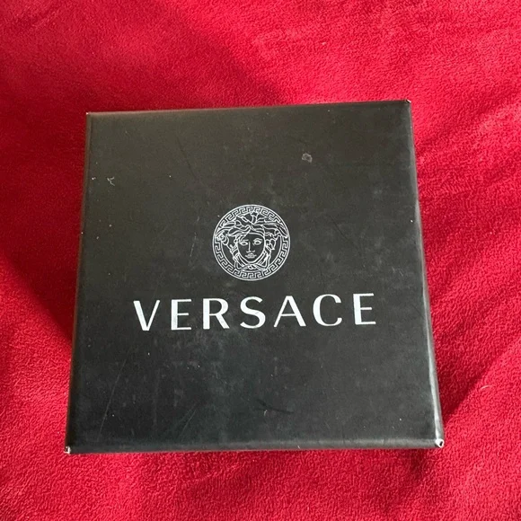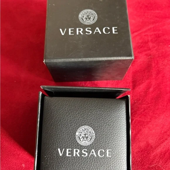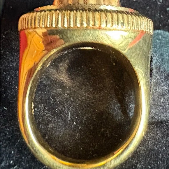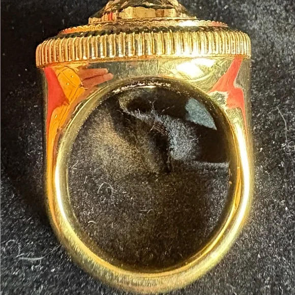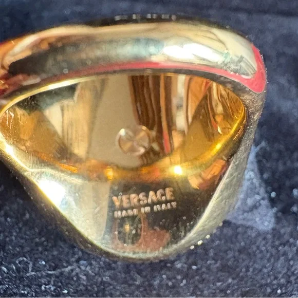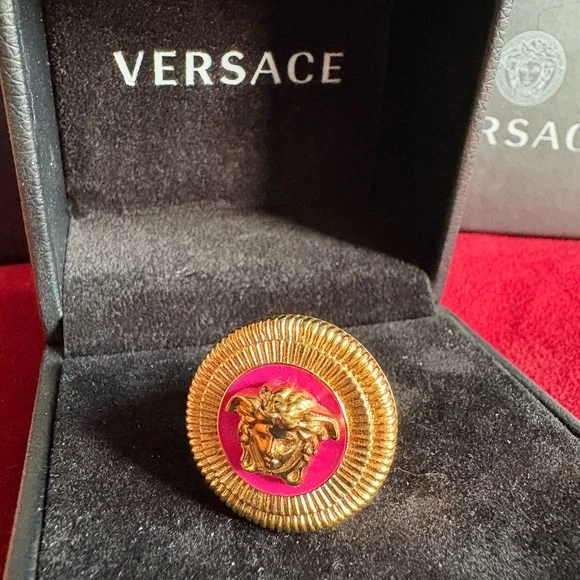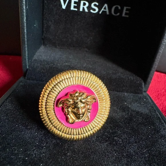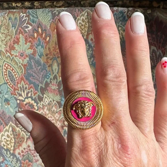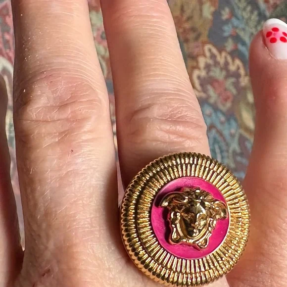 Elegant Versace ring featuring a gold Medusa design on a vibrant pink background. Perfect for adding a touch of luxury to any outfit.There’s a marking inside that says 17. Not sure if that’s the size? I’m guessing it’s around a size 9 or 10. It’s large on my ring finger and fits my first finger well.