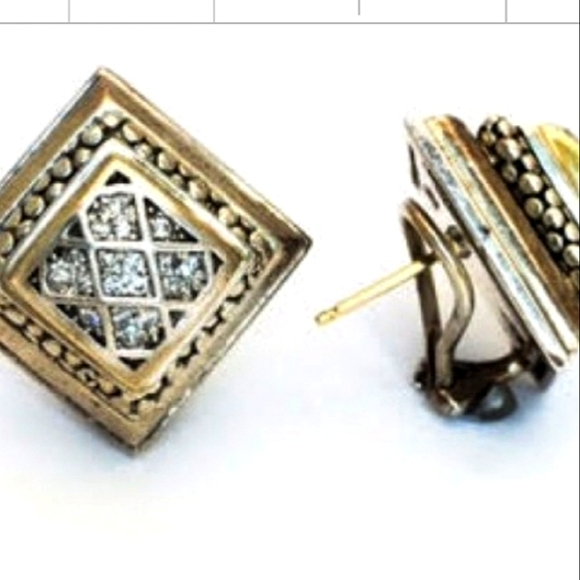 Michael Dawkins Sterling Silver & Gold Pyramid Earrings with friction posts and omega backs.Measures 3/4" x 3/4" & 1/2" deep. Contains 36 round brilliant diamonds totaling...
