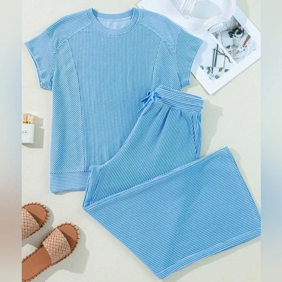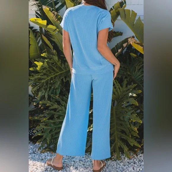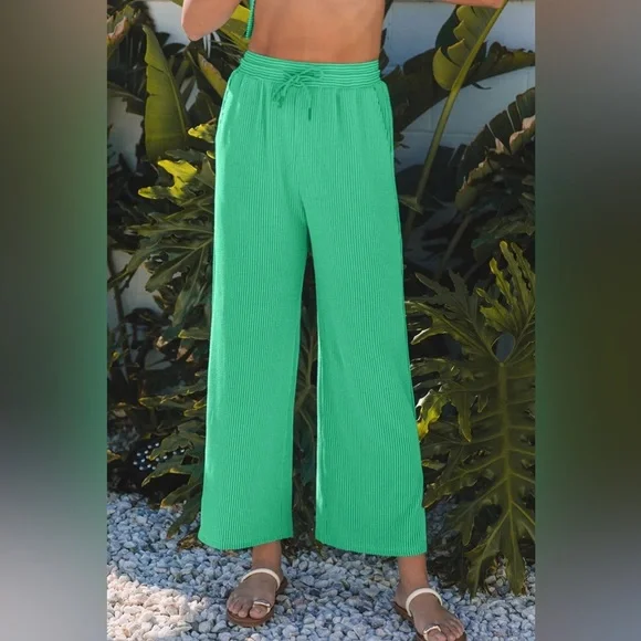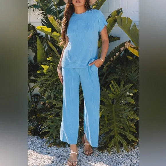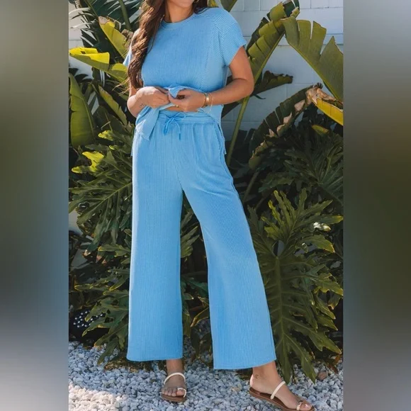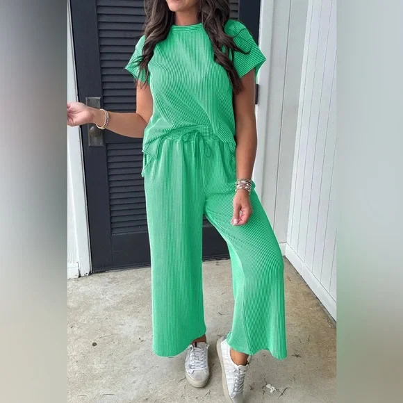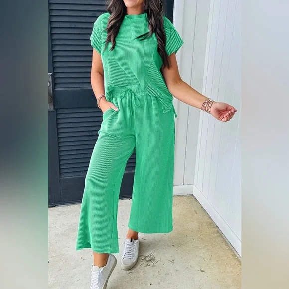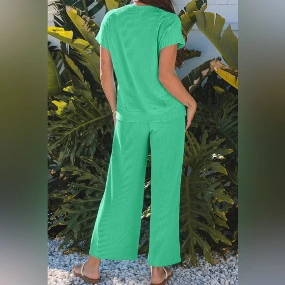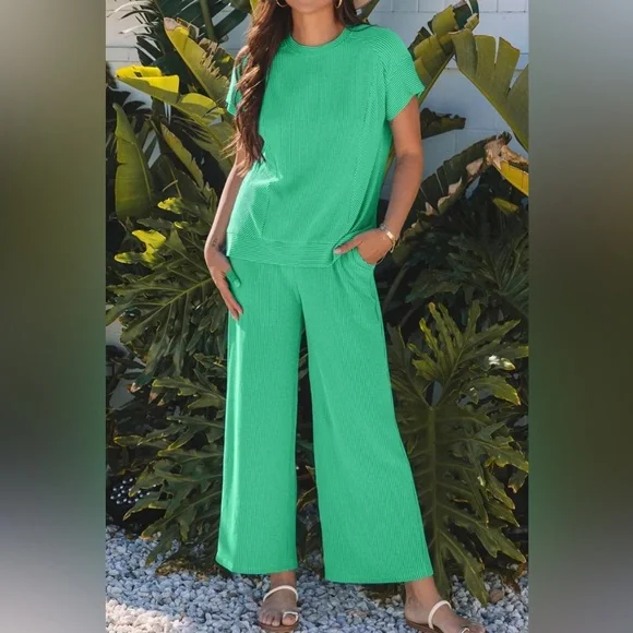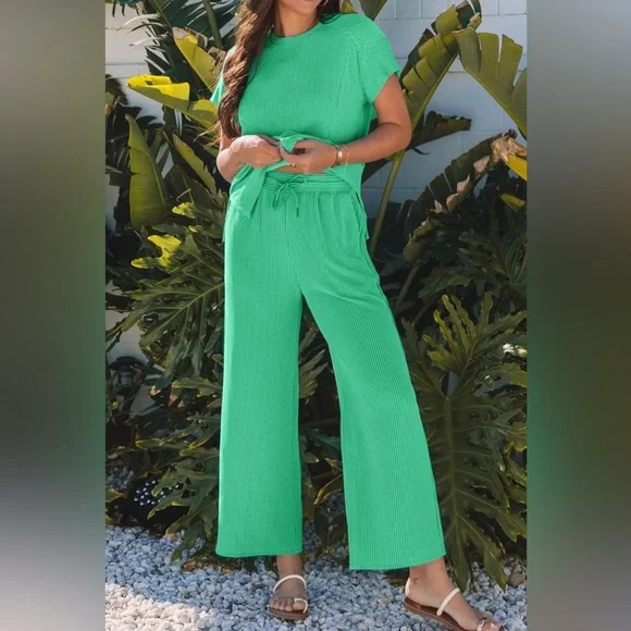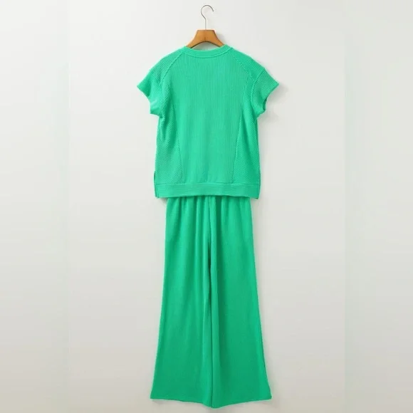 Green Wide Leg Pants Round Neck Top SET