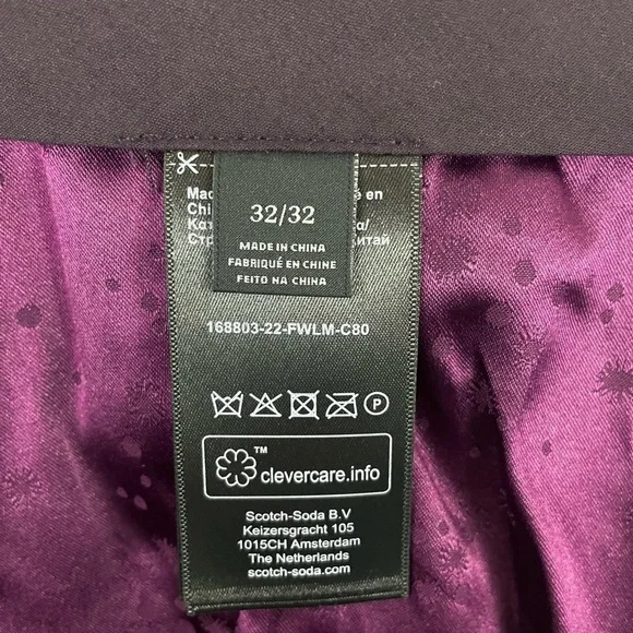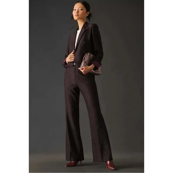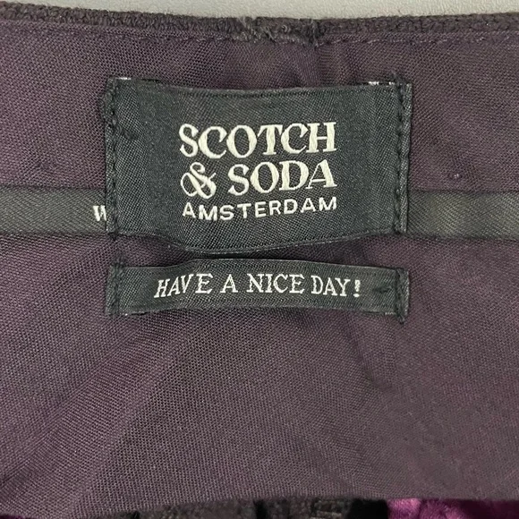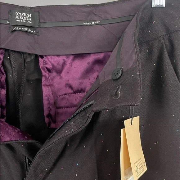 Scotch & Soda Women´s High Rise Flare Sequin Pants. In a deep maroon shade, a purple-red-brown shade.Interior purple lining detail. All over multi color sequins. Zip and button closure. Condition – Brand new with tags, tag has some damage. Material – Body 67% polyester 30% wool 3% elastane Size – 32/32 Measurements are approximate: *Inseam-32"*Rise-13"*Waist across front-16"-Please check measurements for fit. -Items from smoke free home. I do have pets.