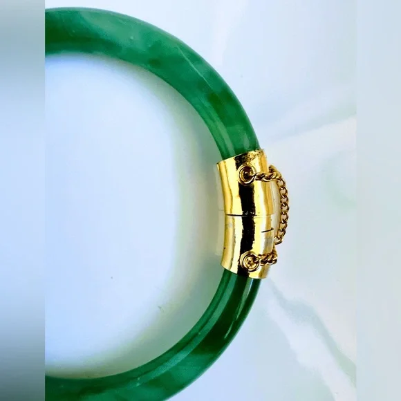 This antique bracelet features a natural spinach green jade AAA stone in a round shape, set in 10k plated yellow gold. The bangle style bracelet is adorned with the original safety clasp for secure wearing. With a nature-themed design, this 7.5-inch bracelet showcases the beauty of the green jade stone against the rich gold metal, creating a timeless and elegant piece of fine jewelry.