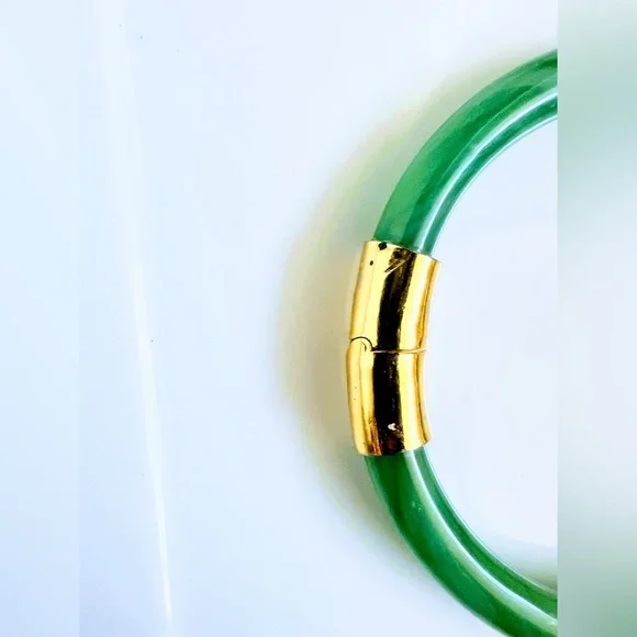 This antique bracelet features a natural spinach green jade AAA stone in a round shape, set in 10k plated yellow gold. The bangle style bracelet is adorned with the original...