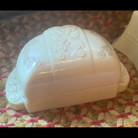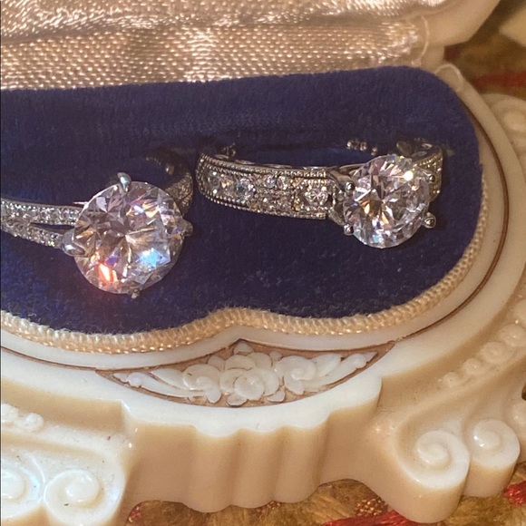 LADIES AMAZING ANTIQUE WEDDING SET BRIDAL IN CELLULOID 1950’s IVORY BOX LEFT RING 2KT LAB DIAMOND WITH SMALL PAVE ALONG RING DIAMONDS AND IT IS SIZE 7 RIGHT RING 1.5 KT LAB...