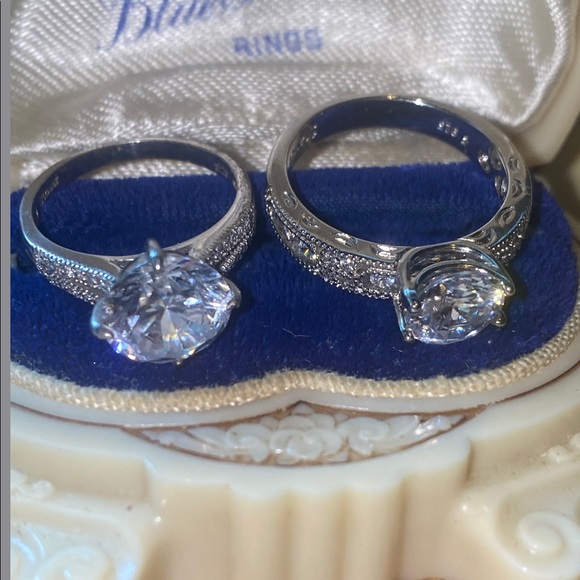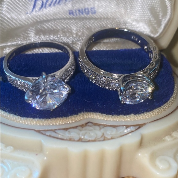 LADIES AMAZING ANTIQUE WEDDING SET BRIDAL IN CELLULOID 1950’s IVORY BOX LEFT RING 2KT LAB DIAMOND WITH SMALL PAVE ALONG RING DIAMONDS AND IT IS SIZE 7 RIGHT RING 1.5 KT LAB DIAMOND WITH DETAIL GOING DOWN SIDES OF PING ALSO A PAVE DIAMOND BITH RINGS .925 STERLING SILVER WITH WHITE PLATINUM GOLD WASH LAST A LIFETIME !! STINES ARE AMAZING TO SEE IN PERSON !!!! BEAUTIFUL COMPLETE SET -OLD VINTAGE SET -
