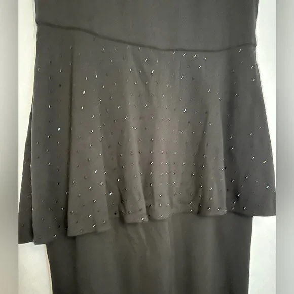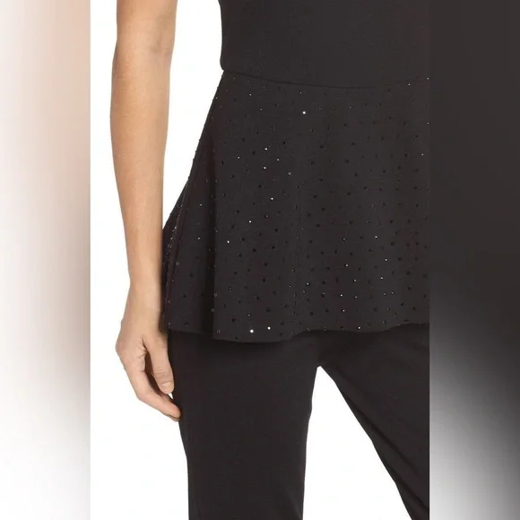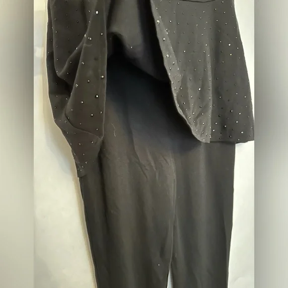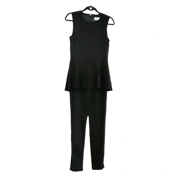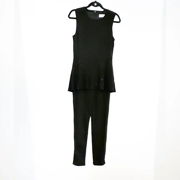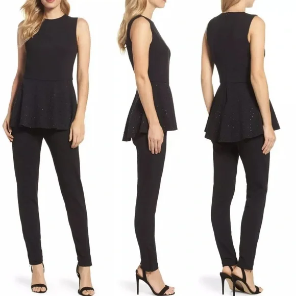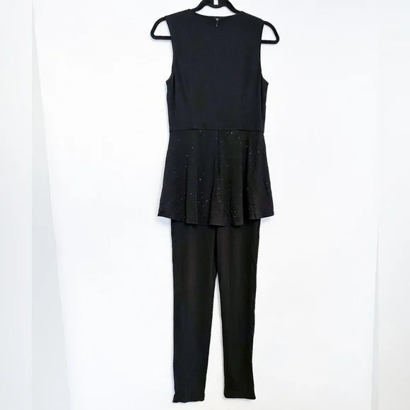 Eliza J embellished jumpsuit in size 4. Sleeveless. Zips from back. Embellished with black rhinestones on top. Fitted legs, with zippers at ankles. Stretchy!Achieve the flawless look of separates with this jumpsuit that pairs a peplum-hem top with slim leg trousers.• Hidden back-zip closure• Rhinestone Peplum Sleeveless• Hidden-zips on ankles• 68% rayon, 27% nylon, 5% spandex• Dry clean• Imported Pre-owned great condition. See photos for any signs of wear, pilling, or damage. One larger snag on back top right shoulder. See close ups. Photos are accurate and considered part of the item description. Ask any questions, happy to help!Stored in a smoke-free/climate-controlled environment. Color may vary on different screens. Photos are taken in Natural and Artificial lighting for your convenience ❤️Eliza J jumpsuit, black jumpsuit, peplum waist, elegant evening wear, date night outfit, formal jumpsuit, chic one-piece, sophisticated style, Gen Z fashion, TikTok fashion trends, versatile outfit, stylish jumpsuit, fitted silhouette, minimalist, easy
