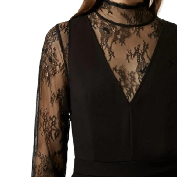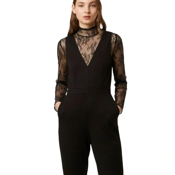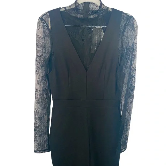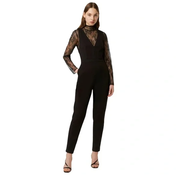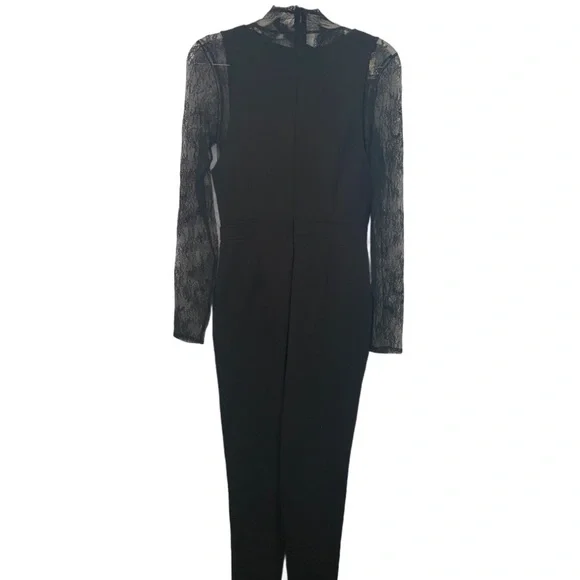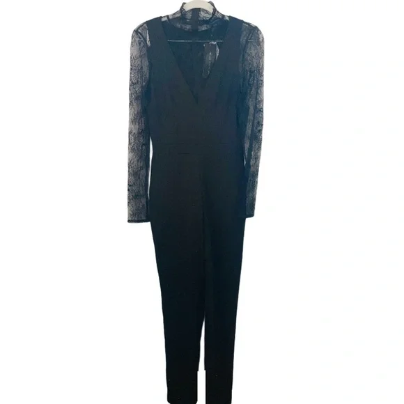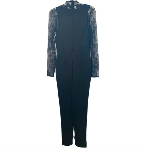 Opt for a contemporary take on party attire in the Tabetha Lula Lace Jumpsuit in Black Size 2. The sleek tailored one-piece jumpsuit cuts a striking silhouette with a flattering slim fit leg and fitted, long-sleeved body. Covered in dainty lace and framed with frills, texture adds interest to the sophisticated piece.Lace jumpsuitSoft , smooth jersey with textured lace detailLong lace sleevesHigh neckBack zip fasteningTailored legSlightly sheer7gmndBrand new NWTNew style[e30]