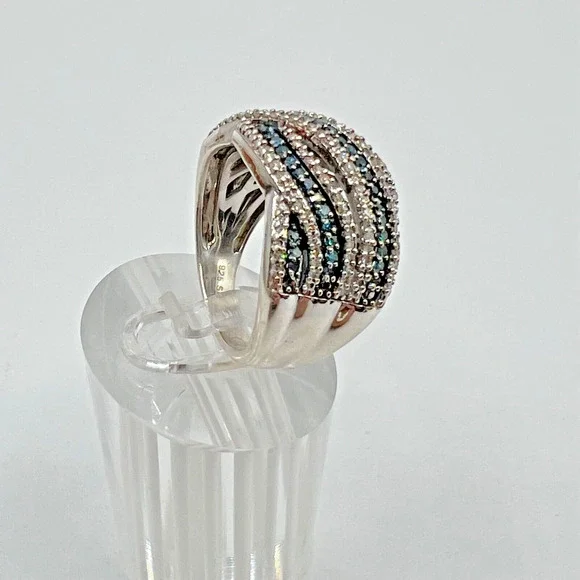 Designer SUN Sterling Silver 925 & Blue Diamonds Ring - Size 7.5