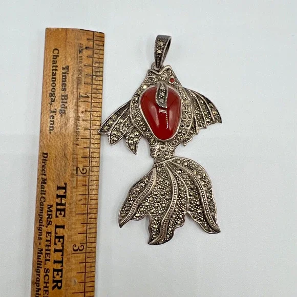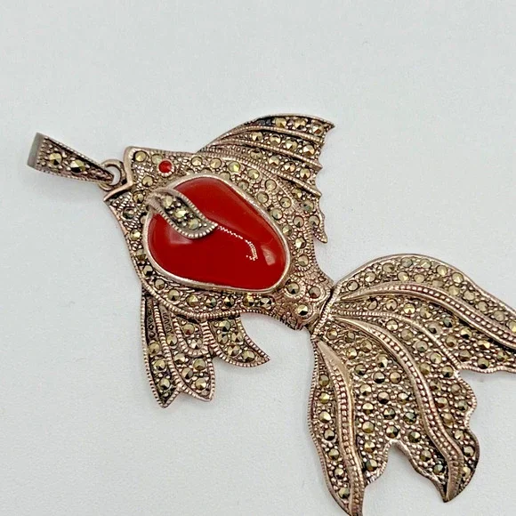 Estate Vintage Sterling Silver & Marcasite KOI Fish Articulated PendantTail "swims" with movementSee photos as part of description
