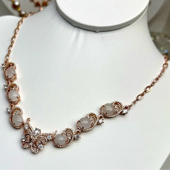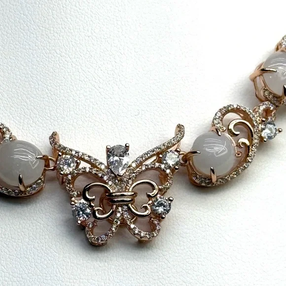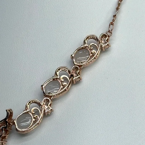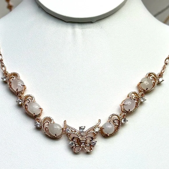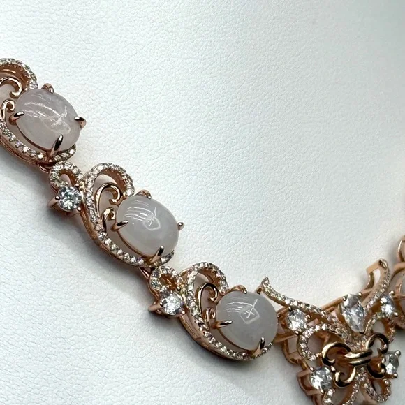 Item #NJD3PREMIUM QUALITY WHITE JADEITE (No Inclusion, White Nephrite Jadeite Jade)!ALL PRECIOUS METALS! ABSOLUTELY UNIQUE NECKLACE!ITEM DESCRIPTION:Main Precious Metal: Solid Sterling Silver;Necklace Top Precious Metal Plating: 18K Rose Gold; Weight of Precious Metals: approx 23g;Stamp: S925;Main Stone: Natural Grade AAA WHITE NEPHRITE JADE Jadeite;Main Stone Size: approx 9.2mmx9mm;Main Stone Cut: Round-Oval shape—6 Stones; Main Stone Country of Origin: Myanmar;Side Stones: White Cubic Zirconia;Necklace Length: 16.5”+1.5” extension;Necklace Type: Contemporary Dainty, Chain and Link;Necklace Style: Unique Contemporary;Necklace Clasp: Lobster Clasp;BONUS: Gorgeous Paper Clip Chain that can be used as a clasp holder, so Necklace can become a ONE-OF-AKIND CHOKER!Jadeite Jade believed to bring good luck, fortune and friendship!WHITE NEPHRITE Jade’s energy is peaceful, joyful and wonderfully practical!WHITE NEPHRITE is very rare and valuable, it holds a lot of meaning and plenty of healing properties!White Nephrite Jadeite Jade Month: March, December and May!White Nephrite Jadeite Jade Zodiac Sign: Pieces, Taurus and Sagittarius!White Nephrite Jadeite Jade Chakra: Heart Chakra, Crown Chakra and Third Eye Chakra!See pictures please!