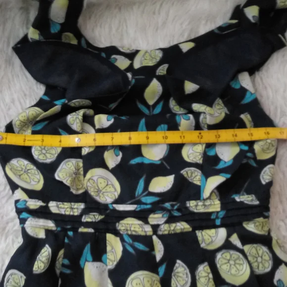 Fame & Partners The Vorsane Playsuit Romper Lemon Size 6Flutter sleeves, open back, and defined waistInvisible zipper closureColor/pattern: lemon printShell: 86% nylon, 14% spandexLining: 100% polyester“Snag on front bottom of shorts, please see photos, otherwise it is Gently worn, in excellent condition.