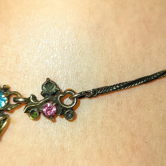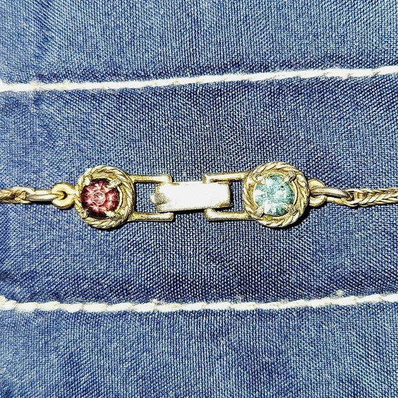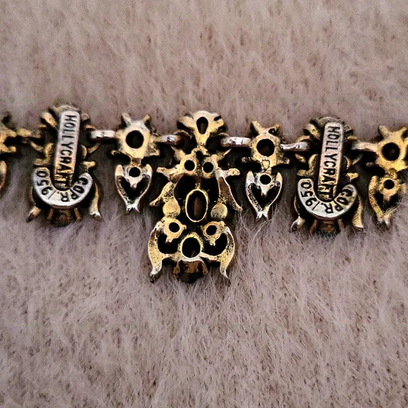 Authentic vintage holly craft. missing 1 tiny stone (last). otherwise in wonderful condition.clasp works as good as it did 70 yrs ago. Brushed good and multi colored jewels.
