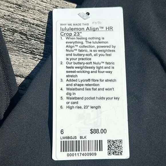 Lululemon Align Crop 23"BlackFocus on your practice in the buttery-soft Align yoga collection, designed to free you from distraction and embrace your every move.nulu™Lightweight, buttery-soft Nulu™ fabric wicks sweat and is four-way stretchbuttery-soft handfeellightweightsweat-wickingfour-way stretchfeaturesDesigned for: YogaLycra®: Added Lycra® fibre for shape retentionWaistband: Smooth, flat waistband seams are low profile and won´t dig inWaistband storage: Pocket on the waistband holds your key or cardHigh-rise: Keeps you feeling covered and secureInseam: 23"Naked sensation: Engineered to feel like your go-to, lightweight, second-skin layer—you´ll forget you´re wearing this next-to-nothing sensation as you move