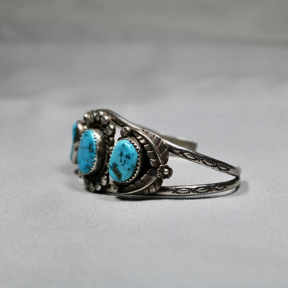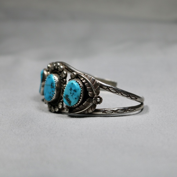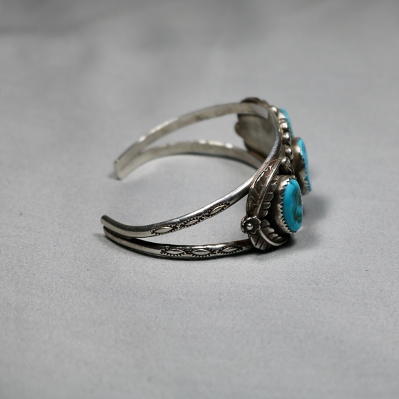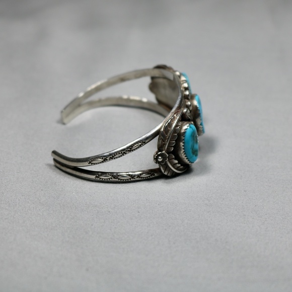 gorgeous handmade vintage 925 sterling silver bracelet cuff with natural turquoise stones in excellent condition light signs of wear and is marked PT STERLING. the bracelet...