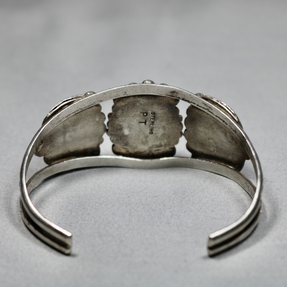 gorgeous handmade vintage 925 sterling silver bracelet cuff with natural turquoise stones in excellent condition light signs of wear and is marked PT STERLING. the bracelet measures 7 1/2" which includes 1 1/4" gap and is 1 1/4" wide please contact me if you have any questions thank you