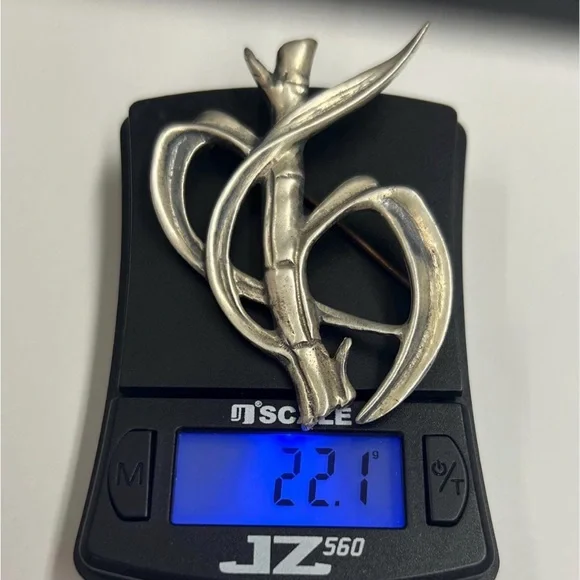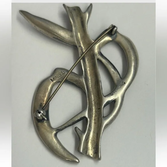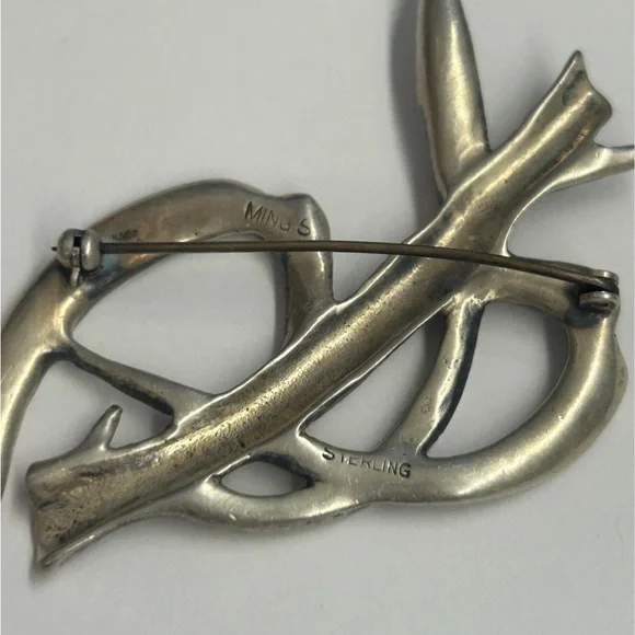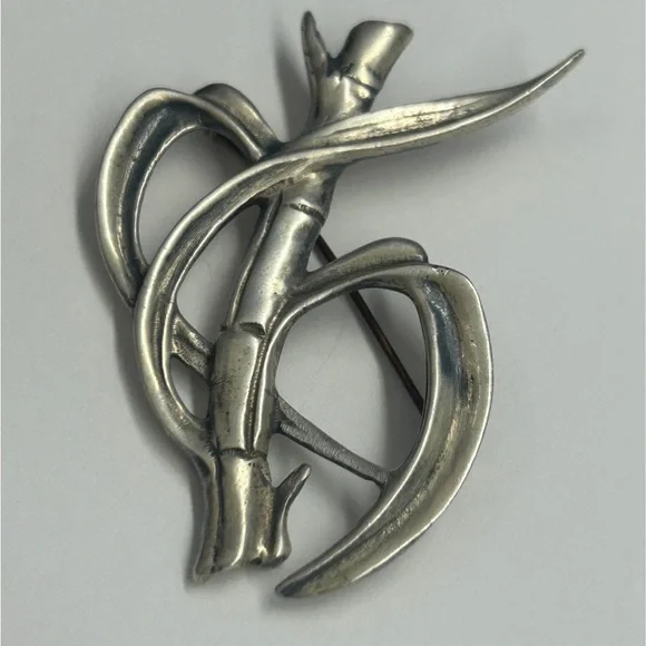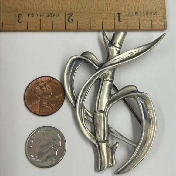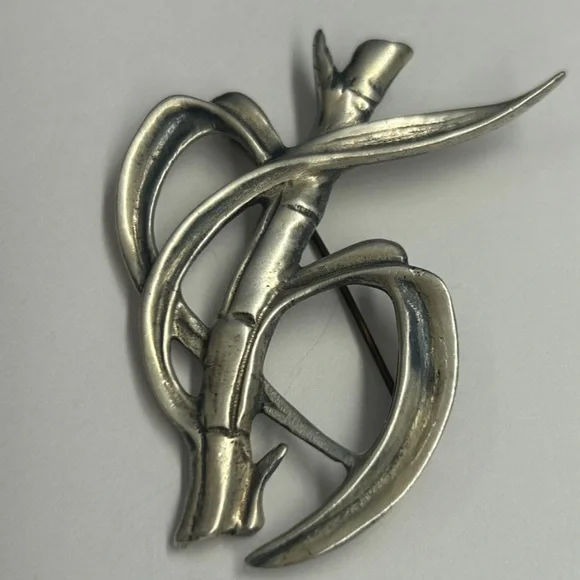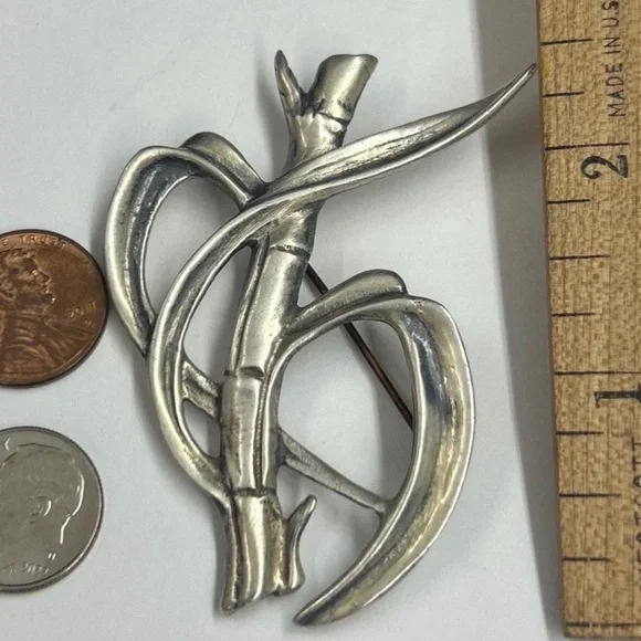 Vintage ming’s of Honolulu sterling silver bamboo brooch pin . The dimensions are approx 2.75” X 2” . .Hallmark: Ming’s sterling on the reverse. Good Condition. .Please use pictures for condition as they are a big thing part of the item description.From smoke free and pet free home. Elegant silver brooch with bamboo design. Perfect for adding a touch of nature-inspired style.