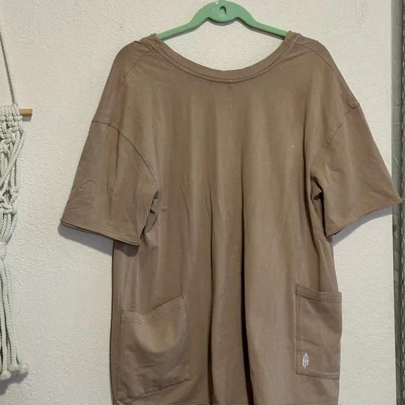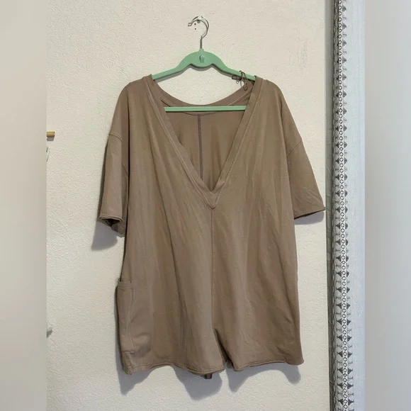 NWOT Hot Shot Tee Romper Size Small - Mocha Latte Fit: Shapeless, oversized fit; shorty-lengthFeatures: Soft fabrication with a stretchy feel, scoop neckline, ribbed trim, patch pocket detail at front, V-shaped back, dropped sleeves, raw hemlinesSpot from the wash - came this way. Never worn