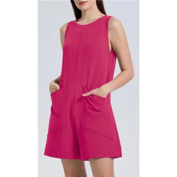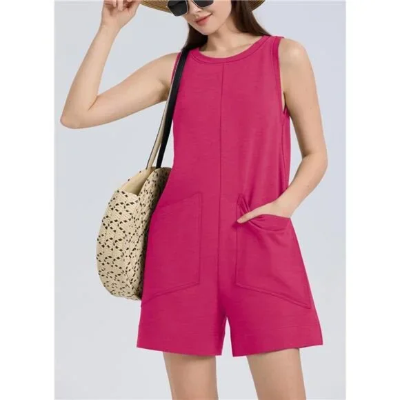 *Color: Rose*Material: Our womens rompers are made from 70%Cotton,23%Polyester,7%Spandex. The high-quality and skin-friendly fabric will offer you a perfect level of comfort and coziness.*Features: crewneck sleeveless romper, elastic waist with drawstring, one-piece overalls, back keyhole with button, invisible side pockets, loose fitting.*Occasion: The back button makes this romper easy to put on and take off; perfect for casual, work, lounge, cruise, semi-formal occasions, parties, cocktails, weddings, sports, exercise, travel, club, vacations, birthdays, outdoor activities, dinner and casual daily wear. A cute perfect for summer and spring weather!*Matching: The rompers for women can be worn alone in summer and spring, they are also nice to match with jackets, sneakers, sandals, heels, and a hat for outwear.*Maintenace: hand wash or machine washable in cold water, hang to dry.