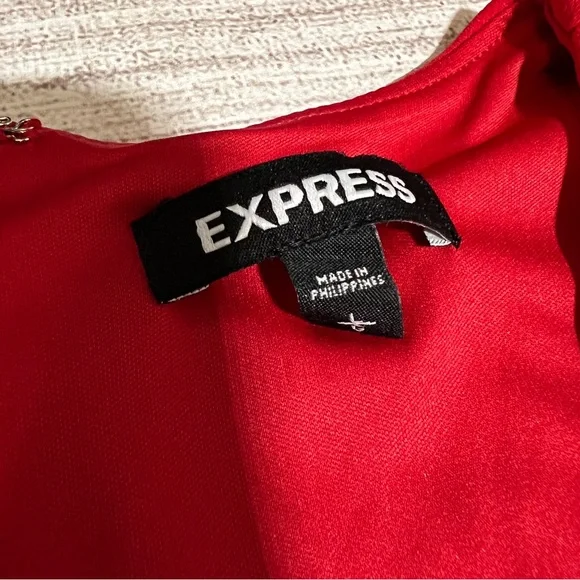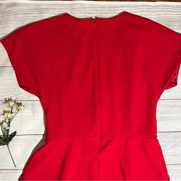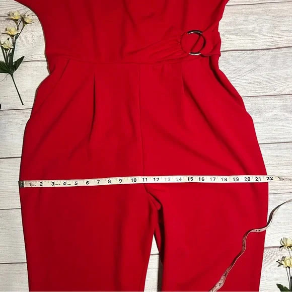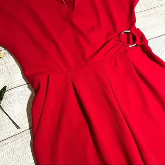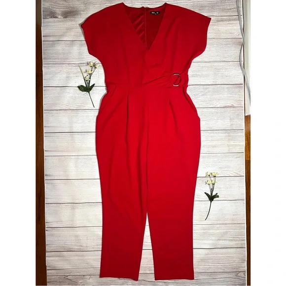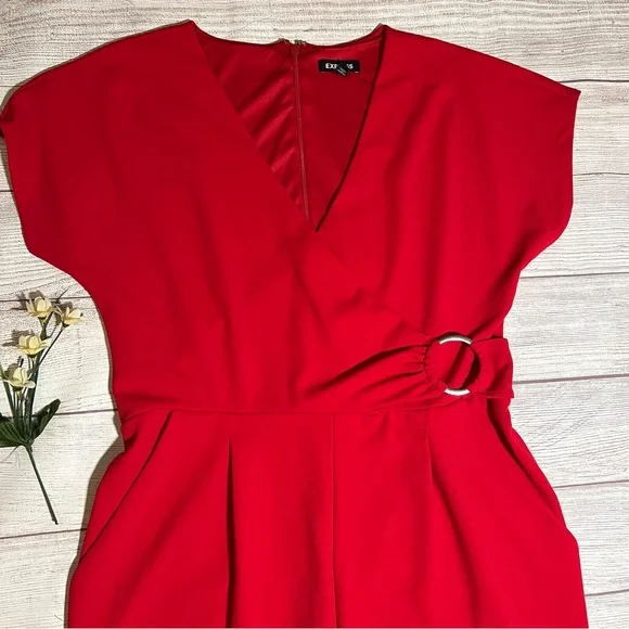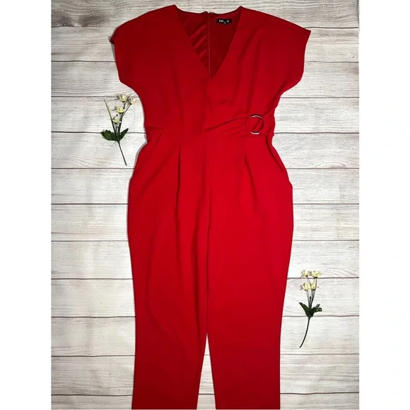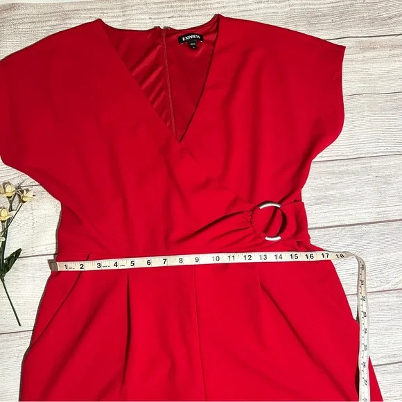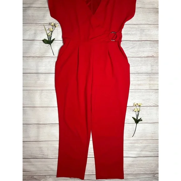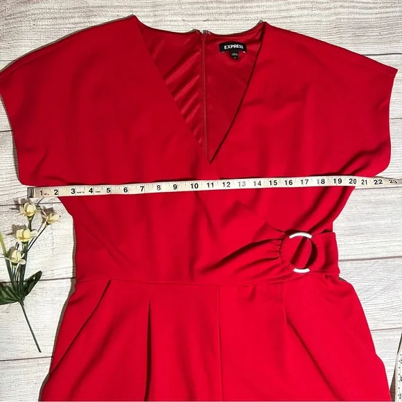 Express Wrap Front O-Ring Jumpsuit• New without tags• Red• Faux wrap front • V-neck• Hidden back hook and zip closure• Short cap sleeves• Side o-ring accent• Slant...