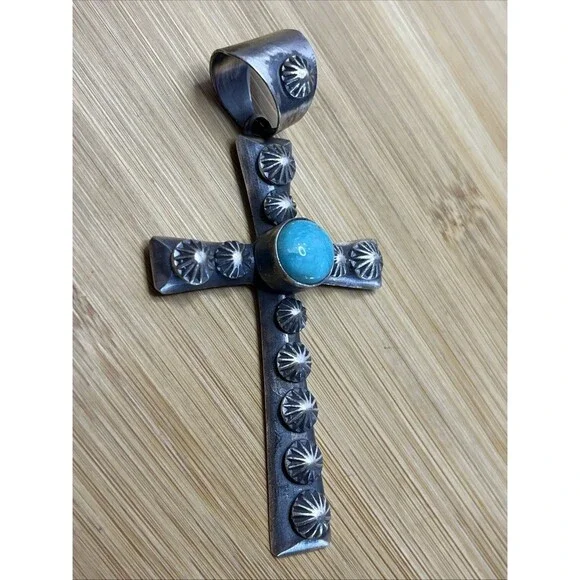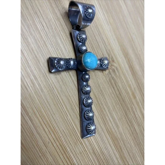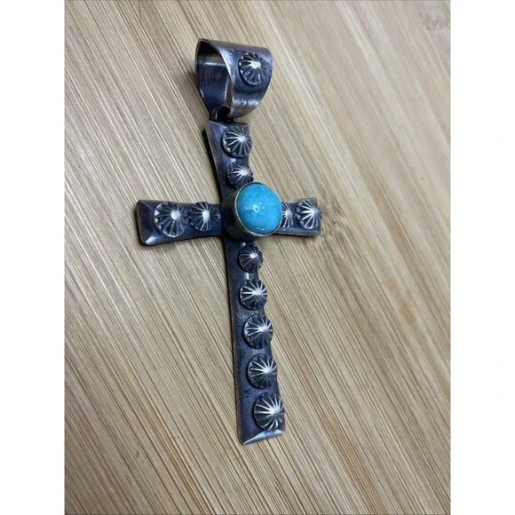 This beautiful pendant showcases the artistry of the Native American culture with its sterling silver cross design and blue turquoise stone. The round, handmade piece is a must-have for any collector of ethnic and regional style jewelry. The pendant is perfect for both men and women, and its unique design will surely catch the eye of any jewelry enthusiast.48.6 grams