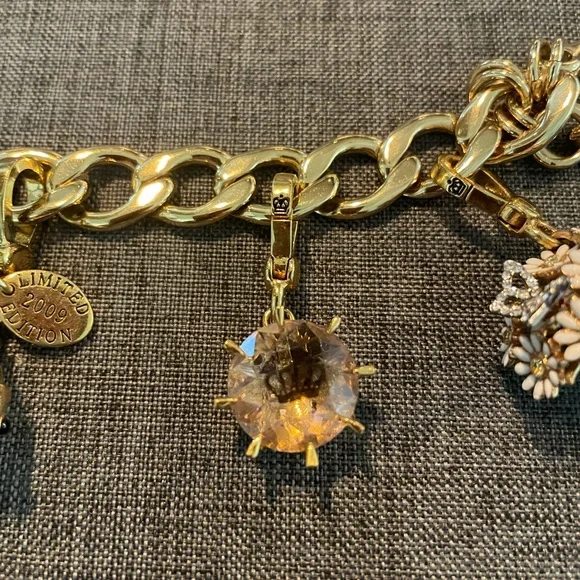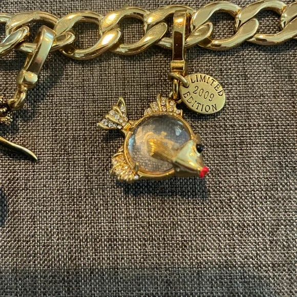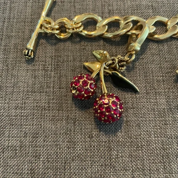 Juicy Couture Gold Collectible Charm Bracelet. Includes rare, daisy bouquet charm, pave cherry charm, pink crown gem rhinestone charm and limited edition angel fish charm. Like...