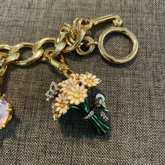 Juicy Couture Gold Collectible Charm Bracelet. Includes rare, daisy bouquet charm, pave cherry charm, pink crown gem rhinestone charm and limited edition angel fish charm. Like new!