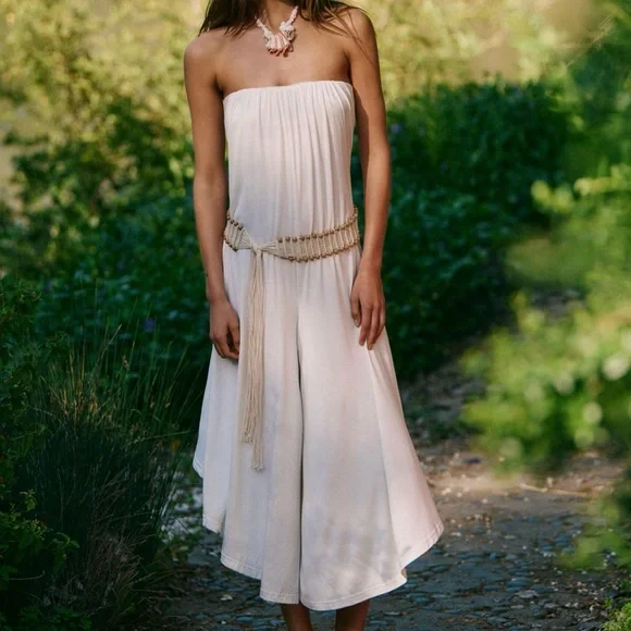 Perfectly billowy, this effortless jumpsuit from free-est features extra-wide, cropped legs with a strapless bodice and semi-open back.Fit: Relaxed, billowyFeatures: Flowy knit fabrication, strapless, cropped wide legs, inverted hem, bandeau-style backing, V-cutout at back, built-in shelf braPair with a floppy hat, bangles, and your favorite sandals for a getaway-ready moment.Measurements for size SmallInseam: 25.25in = 64.14cm• Bust: 29.5in = 74.93cmCare• Machine Wash ColdContents• 95% Viscose, 5% Elastane
