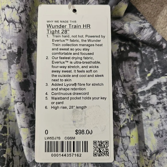 Train hard, not hot. Powered by Everlux fabric, the Wunder Train collection manages heat and sweat so you stay comfortable and focused.Everlux fabric is engineered to keep you feeling cool and dry inhot, sweaty indoor environments• Sleek look and feel• Feels cool on skin• Ultra-breathable• Lightweight• Sweat-wicking• Quick-drying• Four-way stretchFeatures• Designed for: Training• Lycra: Added Lycra fibre for shape retention• Continuous drawcord: Won´t get pulled inside or lost in the wash• Waistband storage: Pocket on the waistband holds your key or card• Rise and inseam: High rise, 28" inseamThese leggings showcase a captivating gray and white design, offering a snug fit with their stretchy material. The full-length style and wide waistband ensure comfort and style for any casual occasion.Style Number: W5DJ7SOriginal Price: $98Release Date: 10/2022
