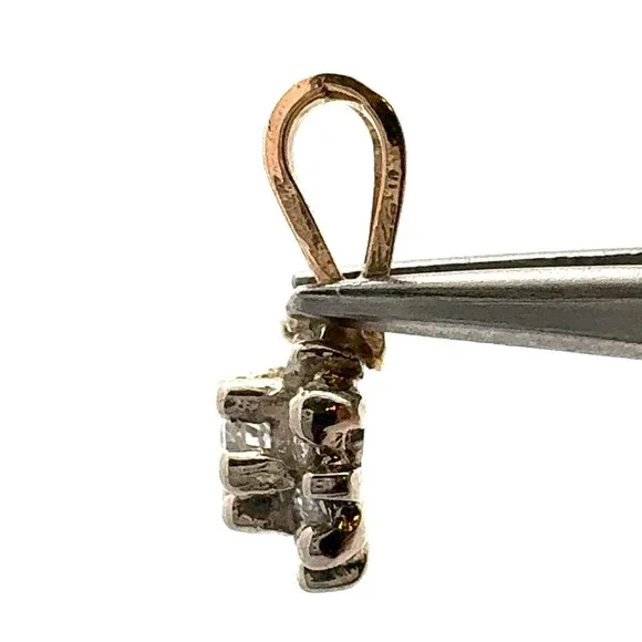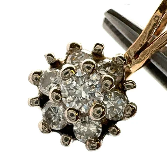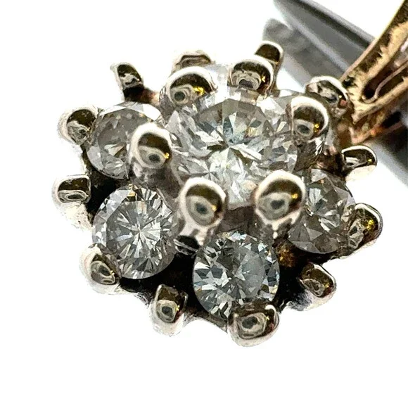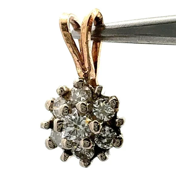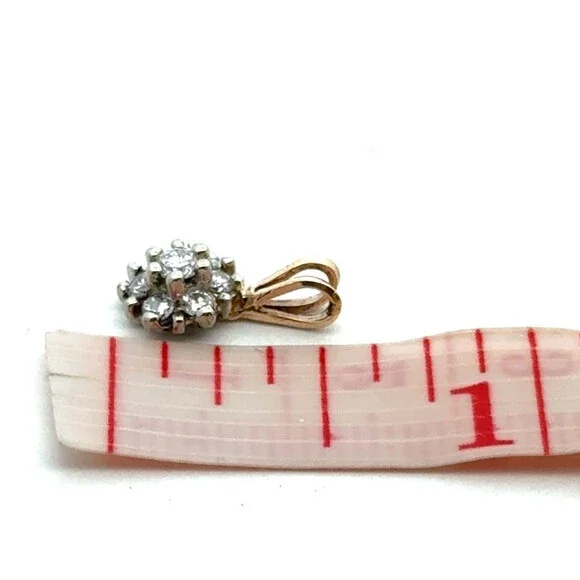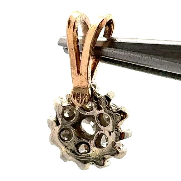 * Estate 14K Yellow White Gold Round Diamond Cluster Petite Pendant* Length including bale: 9/16"* Inner bale measures: 4.5 mm x 2 mm * Width: 5/16"* Weight: 0.6 tgw* 7 Round...