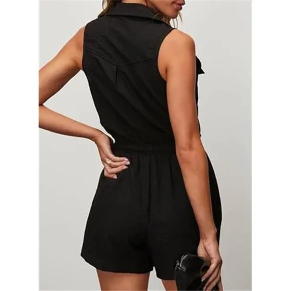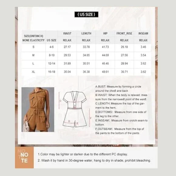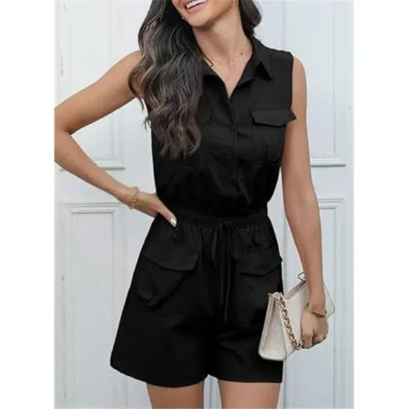 *Material:65%Viscose+30%Polyester+5%Elastane, high-quality fabric, comfortable and breathable for all-day wear, durable material that is resistant to friction and scratches.*Features: Basic Shirt Collar, Sleeveless, Cargo Rompers, Trooper Utility Jumpsuits, Button Down,4 Front, And Back Pocket, Drawstrings Waisted Design, Elastic High Waistline One Piece Summer Outfits.*Adjustable Drawstrings Waist Design: Women´s summer romper with drawstring waistband, Sleek and streamlined silhouette that flatters a woman´s curves, and confident and assertive look that empowers women to take charge.*Trooper Utility Rompers: Simple Sleeveless Rompers with a classic shirt collared are full of strength and fashion, two side pockets are stylish and more convenient when going out.*Versatile Rompers: Versatile and stylish, 4 pockets, showcasing the intersection of fashion and function,suitable for both work and leisure, suitable for holidays, parties, weddings, office, etc.