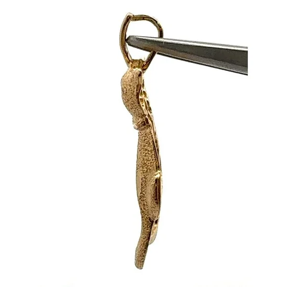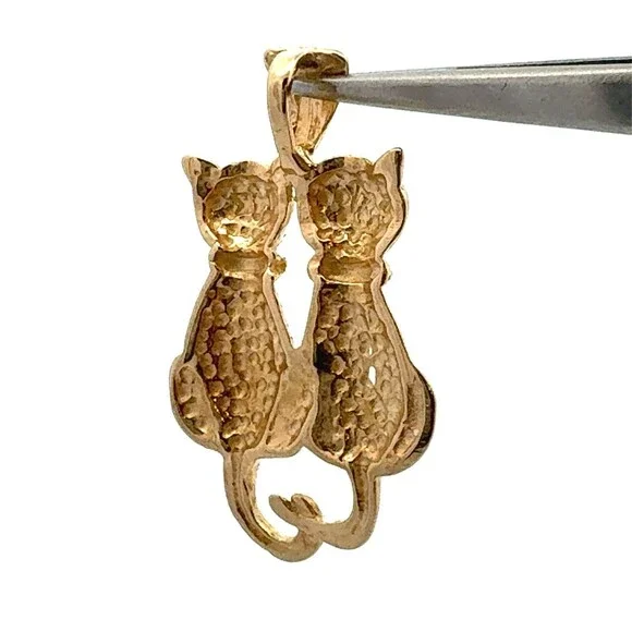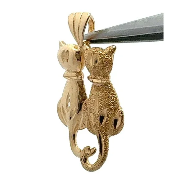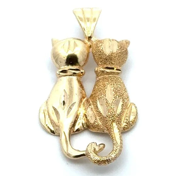 * Estate 14K Yellow Gold Polished Satin Diamond Cut Engraved Couple Kitty Cat Pendant* Length including bale: 1-1/4"* Inside bale measurements: 4.7 mm x 3.4 mm* Width: 5/8"* Weight: 3.3 g * Unmarked* Professionally assayed* Condition: As pictured.* Chain sold separately.* G5036