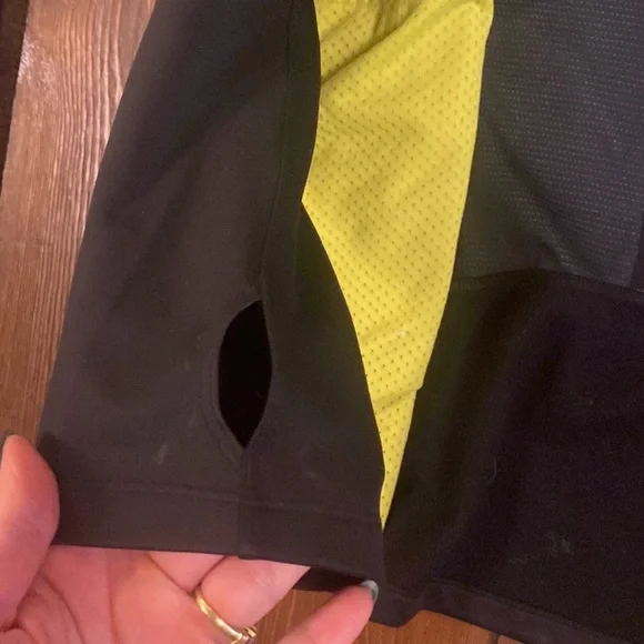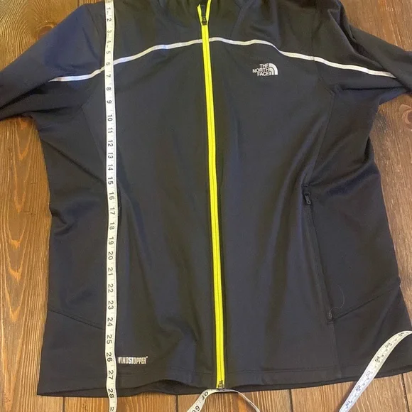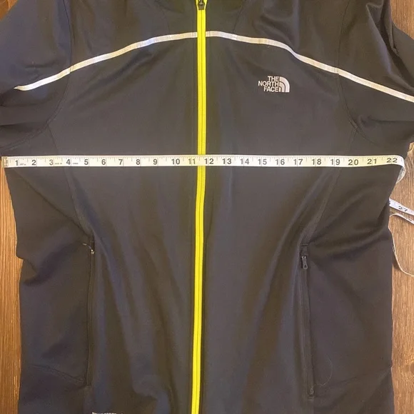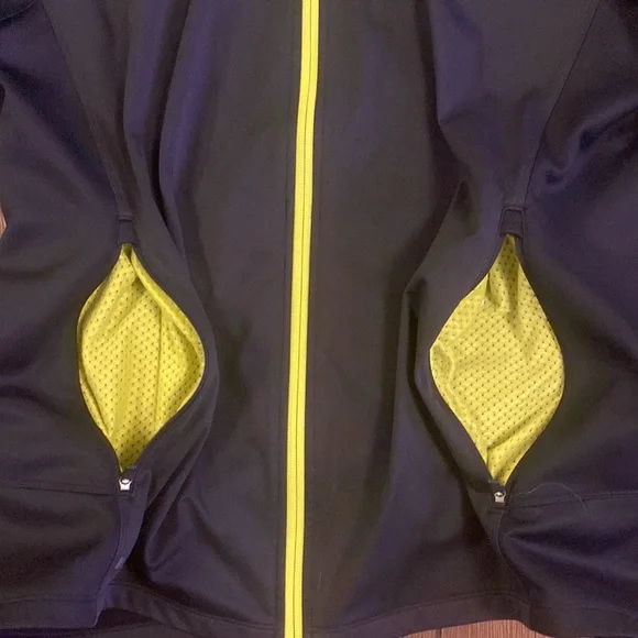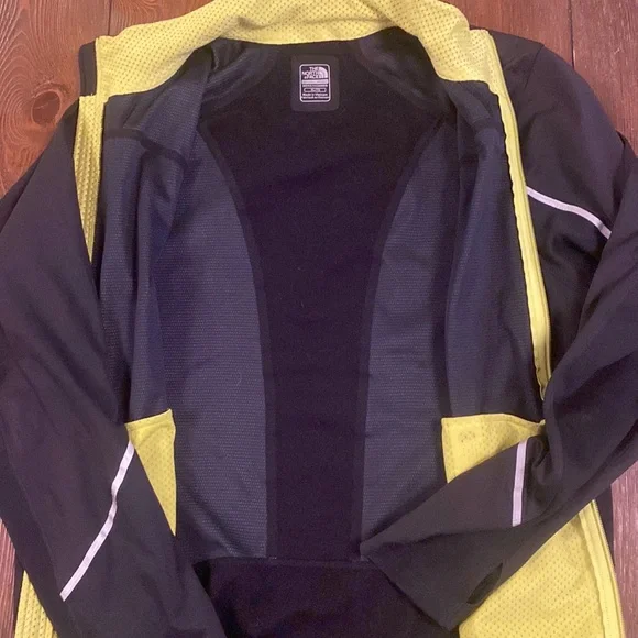 No flaws on this North Face windbreaker in EUC. Two zippered front pockets, thumb holes and reflective tape. Neon yellow accent on zipper and mesh lining. This is an awesome year round jacket!!