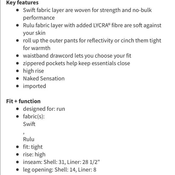 Excellent used conditionLululemon Runderful Two Layer Pant in Black Grape / Space Dye Camo.Size 8Measurements laying flatWaist 16inHips 21inInseam 30inRise 10.5in