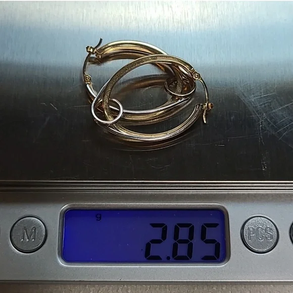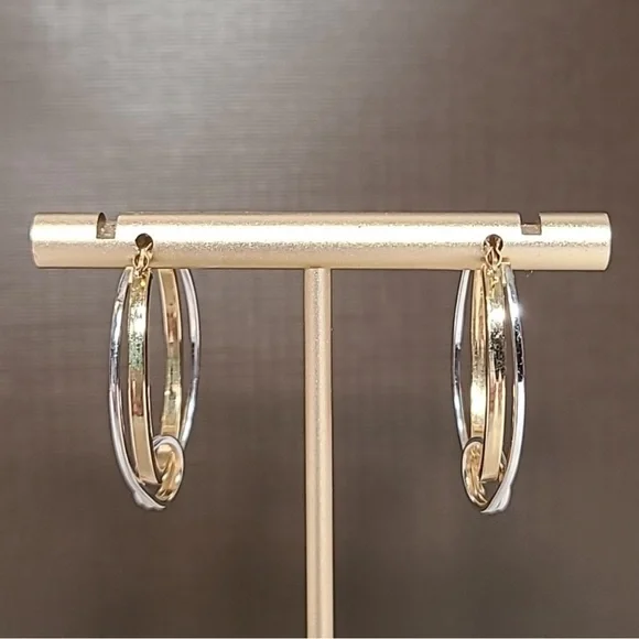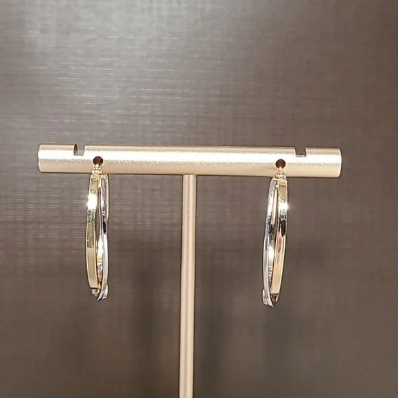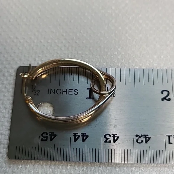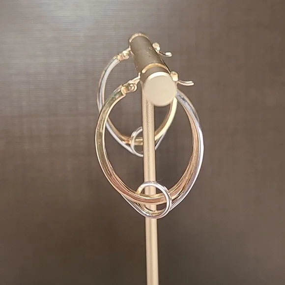 These are unusual and beautiful, dress up or dress down 14 kt solid gold twisted hoop earrings, yellow and white gold combination with hoop at the bottom. Marked 14 kt CJI.2.85...