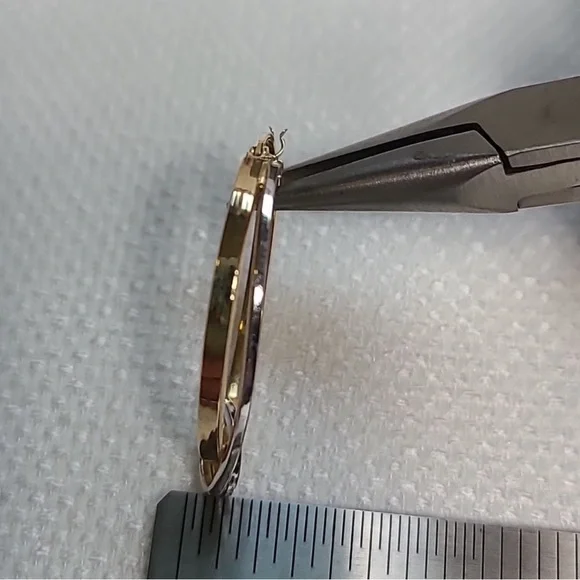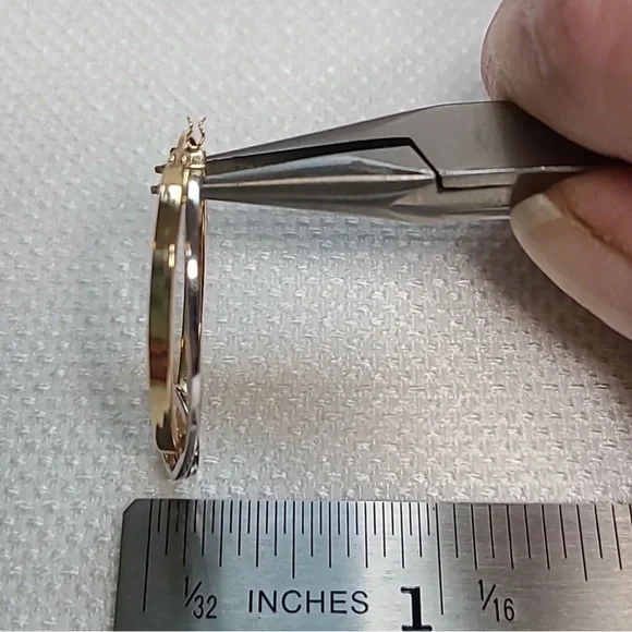 These are unusual and beautiful, dress up or dress down 14 kt solid gold twisted hoop earrings, yellow and white gold combination with hoop at the bottom. Marked 14 kt CJI.2.85 grams approx. Not too heavy so comfortable. Very minor scratching from wear but otherwise excellent previously enjoyed condition. Measurements shown in photos.