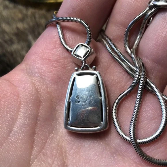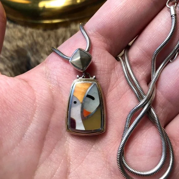 Fantastic ASCH GROSSBARDT sterling silver and 18k gold mosaic Picasso necklace. Beautiful pendant made of a mosaic of shell (mother of pearl, wampum etc), black onyx and coral in the shape of abstract faces set in sterling with a 18k gold rim accent. The bail is a really nice pyramidal black mother of pearl cabochon. Comes on a thick sterling cable chord. Pendant signed and stamped 925 18k 52, pendant 1.25 x max 5/8 inches with bail, chain stamped 925, length 16 inches + 2 1/8 inches of additional chain for adjustment, 13.17g.
