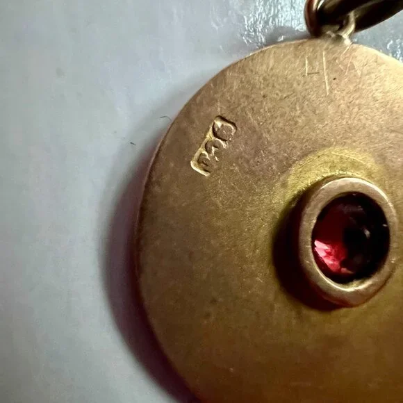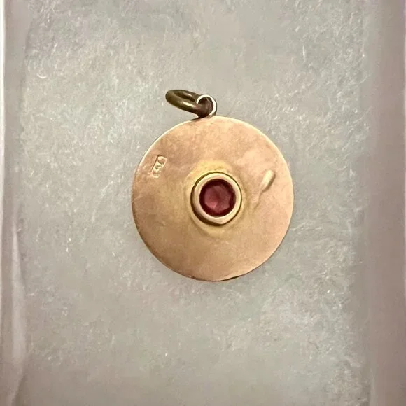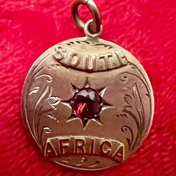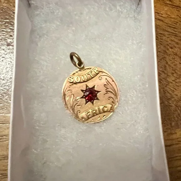 Antique Gold 9CT South Africa Charm for Necklace. Red stone in center, stamped on the back 9CT. Beautiful engraved detail. Perfect condition. Measurement: 11/16 inch.