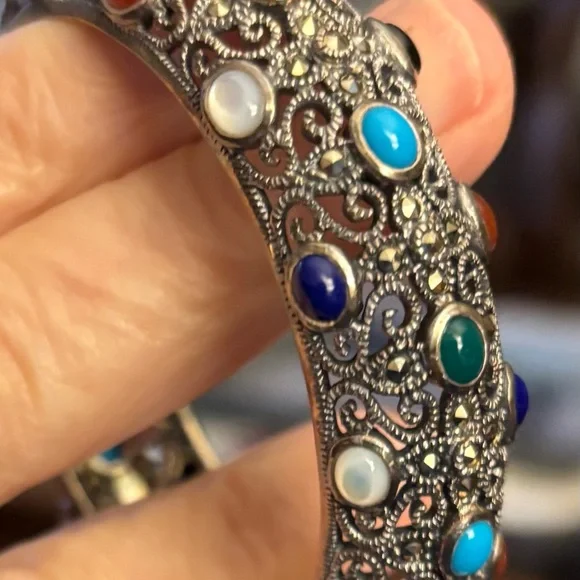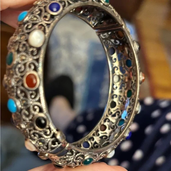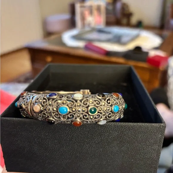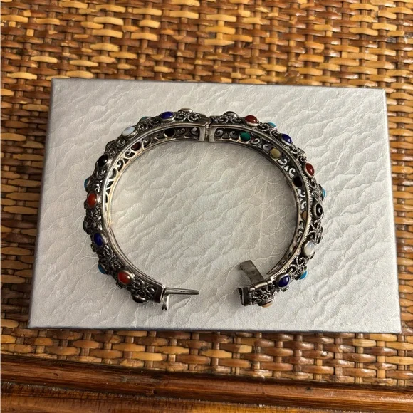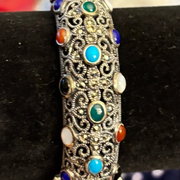This exquisite silver bracelet features a stunning array of multicolor gemstones, perfect for adding a touch of elegance to any outfit. The intricate design and vibrant colors make it a standout piece in any jewelry collection. This piece is sterling silver and has a good clasp and a safety bar that snaps underneath . This bracelet has some weight to it and is a stand alone piece. Outside measures 9” so it would fit up to 7.5.