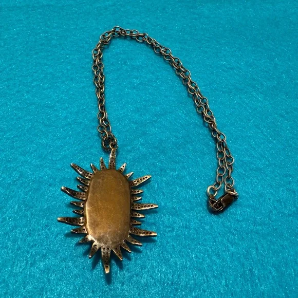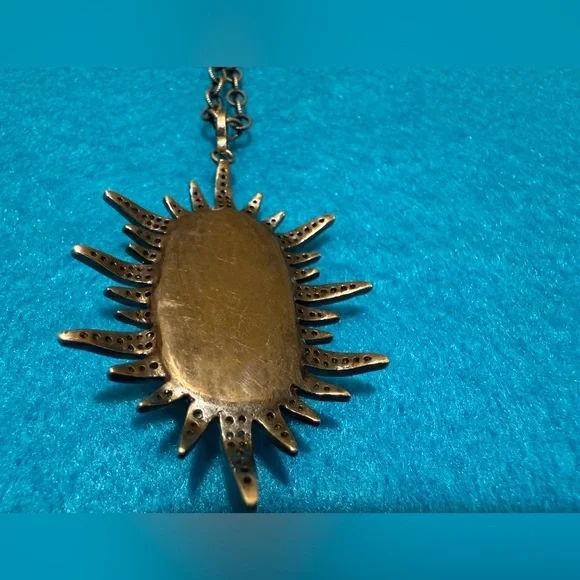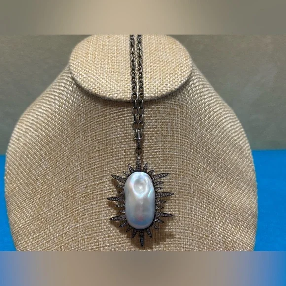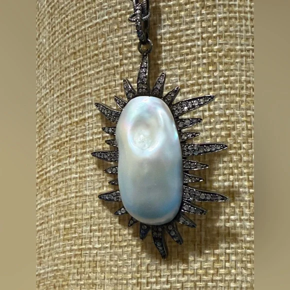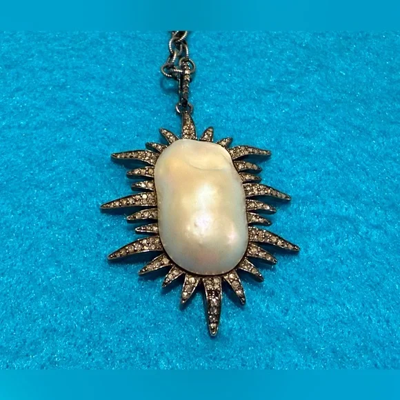 This is a Constance sunburst genuine large baroque Pearl with diamond like stones or crystals.According to my research similar item had listed it as real lace diamonds set in oxidized silver.I don’t test my jewelry although exactly the same. I would just say possibly diamonds or just crystals. The chain is not original tothe pendant so you can change it.It’s a strikingly beautiful piece. Some of the tiny stones may be missing but you can hardly see.The last two pictures are from another site that details the item.Looks exactly like mine but I don’t test the stones.