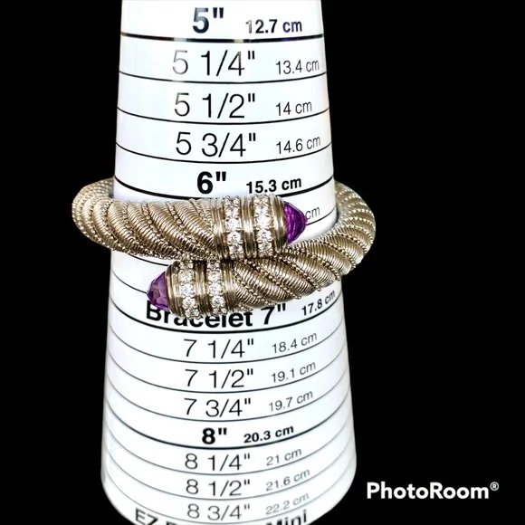 Judith Ripka Sterling Silver hinged cuff bracelet. It is a bypass design with tips in amethyst and diamonique cz’s. See photos for weight and measurement.