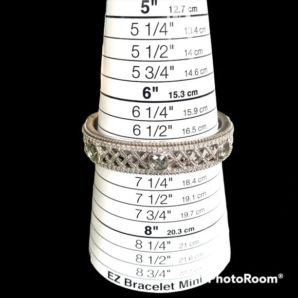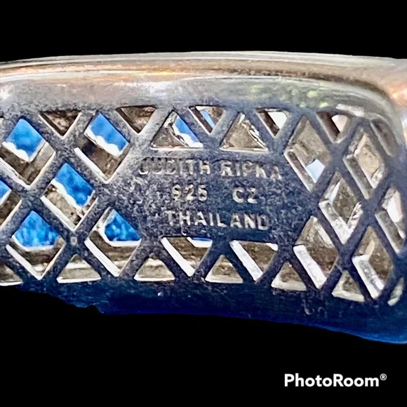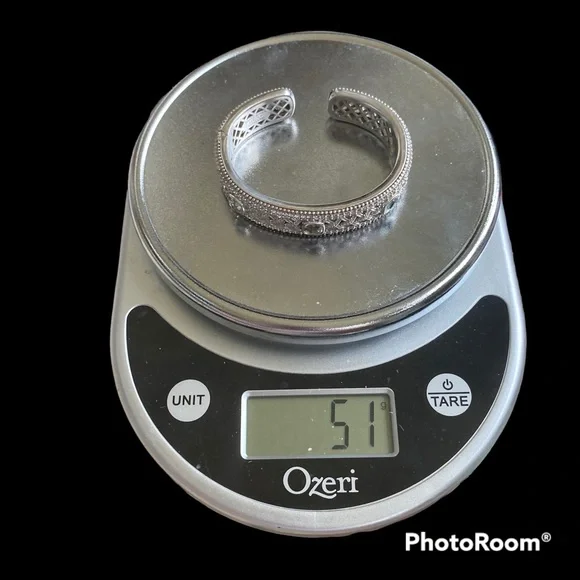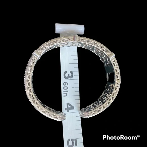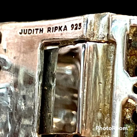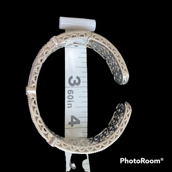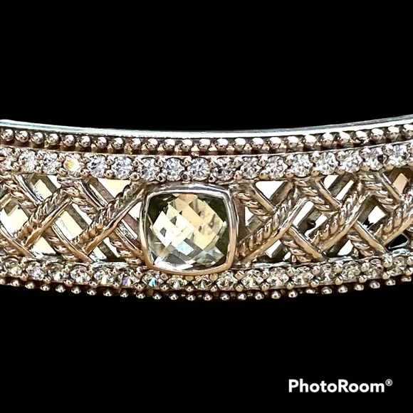 Judith Ripka sterling silver cuff hinged bracelet with three green topaz stones and diamonique cz’s for sparkle in a basket weave design. See photos for weight and measurements.